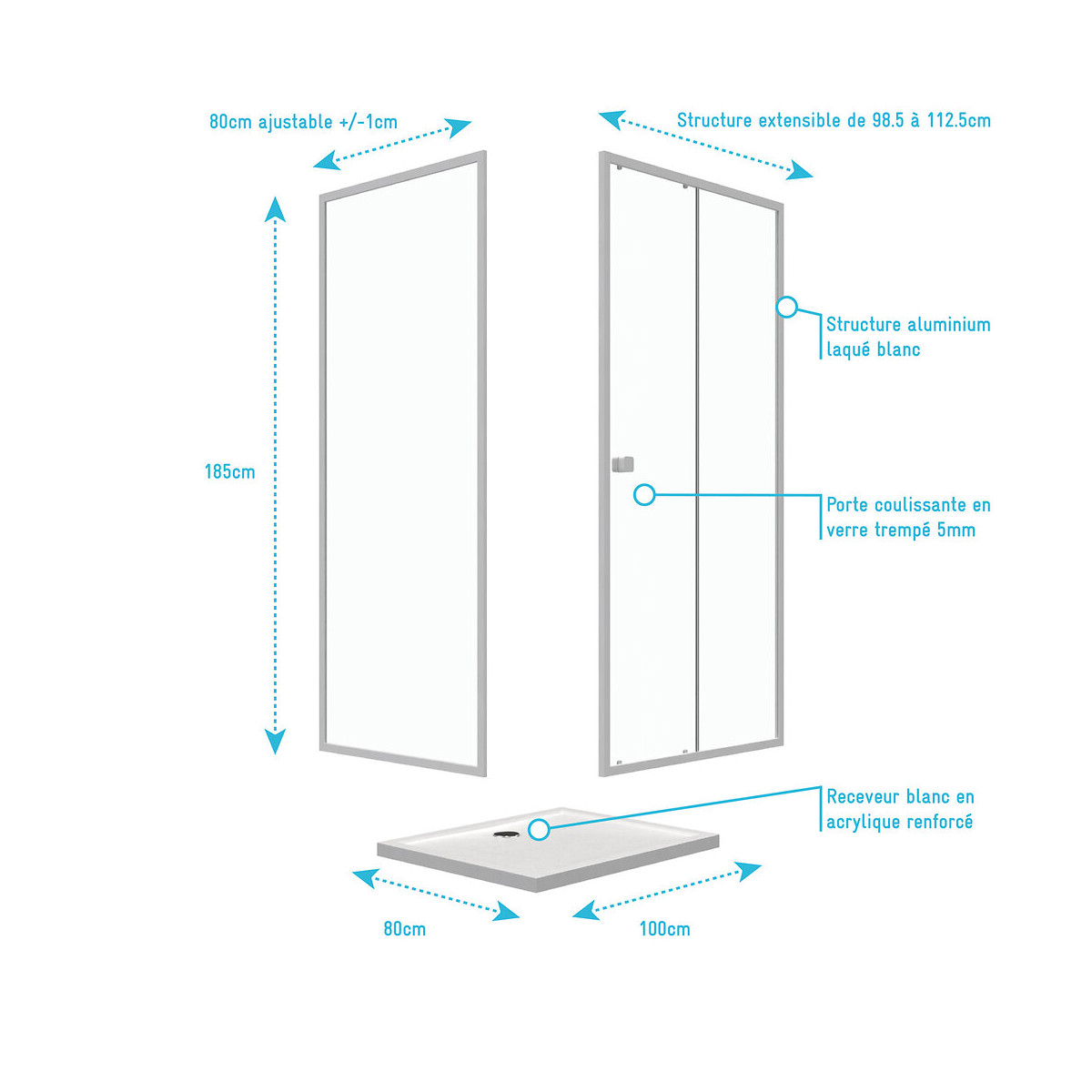 Caractéristiques de la porte de douche : Verre trempé 5mm transparent Poignées doubles carrées blanches Structure en aluminium laqué blanc Système de fermeture magnétique 14 cm de largeur réglable ajustable 98.5 à 112.5 sur la largeur Dimensions 100X185 cm Plus produit : Profilés ajustables pour s'adapter à un maximum de surface La simplicité oui mais avec style Caractéristiques de la paroi de retour : Verre trempé 5mm transparent Structure en aluminium laqué blanc Paroi de retour compatible uniquement avec les parois coulissantes / pivotantes de la même gamme, ne peut être utilisée seule Ajustable +/- 1cm Montage réversible Dimensions 80X185 cm Caractéristique du receveur : Receveur en acrylique blanc Faible épaisseur : 4 cm À poser ou à encastrer dans le sol bonde 90 mm non fournie Dimensions du receveur : 100x80x4cm Réference du produit: PACF044 Désignation du produit: WHITY Garantie 2 ans pièces et non main d'oeuvre. Verre trempé : Le verre trempé est un verre qui a subi un traitement afin d’améliorer ses propriétés. Nous utilisons la trempe thermique qui consiste à porter le verre à très haute température (environ à 700 °C), puis de le refroidir rapidement. Ce processus favorise l'apparition de tensions en profondeur et celle de la compression à la surface du verre. Tout cela a pour effet l’amélioration de sa résistance aux chocs. Il est de 2 à 5 fois plus résistant que le verre simple. Mais aussi diminue grandement la dangerosité du verre car en cas de casse le verre explose en de petits morceaux et non pas en de grands pans tranchants. Pour le reste il conserve les mêmes propriétés que le verre classique Norme harmonisée : EN14428:2004 Certification Européenne: Aptitude au nettoyage : EN14428 :2004+A1:2008 Clause 4.2 Résistance à l’impact / Propriétés d’éclatement: EN14428:2004+A1:2008 Clause 4.3 Durabilité : EN14428:2004+A1:2008 Clause 4.4 MyShowerRoom c’est aussi la garantie de durabilité : Nous garantissons un stocks de pièces détachées d’au moins 5 ans Notre visserie est en acier inoxydable ce qui est une garantie anticorrosion Garantie 2 ans pièces uniquement Cocorico ! MyShowerRoom est une entreprise Française et toute la conception de nos produits est également Française. Ce qui est un véritable plus pour être au plus près de ses clients et avoir une meilleure connaissance de leurs attentes. Qui sommes nous L’HISTOIRE DE MYSHOWERROOM Nous avons créé MyShowerRoom en 2003 avec l’ambition de démocratiser le design et l’innovation dans la salle de bain pour faire de cette pièce un lieu à part entière, un véritable lieu d’histoires à vivre pour toute la famille. Nos cabines de douche et meubles de salle de bain dans l’ère du temps à des tarifs très accessibles. Nos nombreux brevets garantissent l’originalité de notre gamme de cabines de douches. Et nos ingénieurs mettent en œuvre tout leur savoir-faire et toutes les technologies innovantes au service d’une simplicité d’installation et d’utilisation incomparable pour tous. ÊTRE BIENVEILLANT AVEC NOS CLIENTS Notre service client a un objectif : rendre nos clients heureux. Pour cela nous veillons à répondre dans les 24h aux demandes clients. Mais aussi de toujours apporter une solution et entière satisfaction à nos clients. CONSTRUIRE DES PRODUITS TOUJOURS PLUS PERFORMANTS Nos ingénieurs, ainsi que nos équipes terrain consacrent tous leurs efforts à créer des produits adaptés à vos besoins, et toujours plus innovants grâce à nos technologies. Notre objectif est d’être votre unique interlocuteur pour tous vos projets de salle de bain. CONCRÉTISER LES RÊVES DE CHACUN Un projet de salle de bain ? Nous le réalisons ! Lieu de détente et de relaxation par excellence, la salle de bain est une des pièces maîtresse de la maison. Chez MyShowerRoom, nous mettons tout en oeuvre afin que ce rêve devienne réalité. PROPOSER UNE GAMME COMPLÈTE DE PRODUITS Nous vous proposons grâce à notre boutique en ligne une gamme complète de produits Made in MyShowerRoom pour équiper, et accessoiriser votre salle de bain. Un catalogue que nous renouvelons régulièrement avec les dernières technologies MyShowerRoom. APPORTER UNE EXPERTISE HUMAINE Parce que l’humain passe avant tout, nous travaillons avec les meilleurs experts. La satisfaction de nos clients est notre seule et unique priorité. Chaque problème a une solution, et c’est dans cette optique que nous avons mis en place un chat pour échanger directement avec nos équipes. NOTRE CENTRE LOGISTIQUE 11 000 m² d’entrepôt 7000 palettes en stock 1 800 colis traités par jour Plus de 260 préparations de commandes quotidiennes 12 quais de chargement/déchargement CONSEILS & VENTES Une équipe disponible 5 jours sur 7 pour vous accompagner dans vos achats. LIVRAISON GRATUITE Pour toute commande sur le site MyShowerRoom, la livraison est gratuite dans toute la France. UNE GARANTIE DE QUALITÉ Grâce à nos produits brevetés vous bénéficiez de produits uniques. Référence produit: PACF044 Retrouvez plus d'informations produit et des conseils de montage sur le site Aurlane. Remarques importantes: Ces colis sont volumineux, la livraison est effectuée par transporteur spécialisé en bas de chez vous. Les chauffeurs ne sont pas habilités à porter la marchandise, mais uniquement à la décharger. Pas de livraison à l'étage. L'adresse de livraison doit être accessible en camion poids lourd. Dans le cas contraire la marchandise sera mise à disposition au dépôt le plus proche (distance non garantie). Les rendez-vous sont gérés directement par les transporteurs. Attention à bien contrôler la marchandise à réception pour éviter tous litiges.