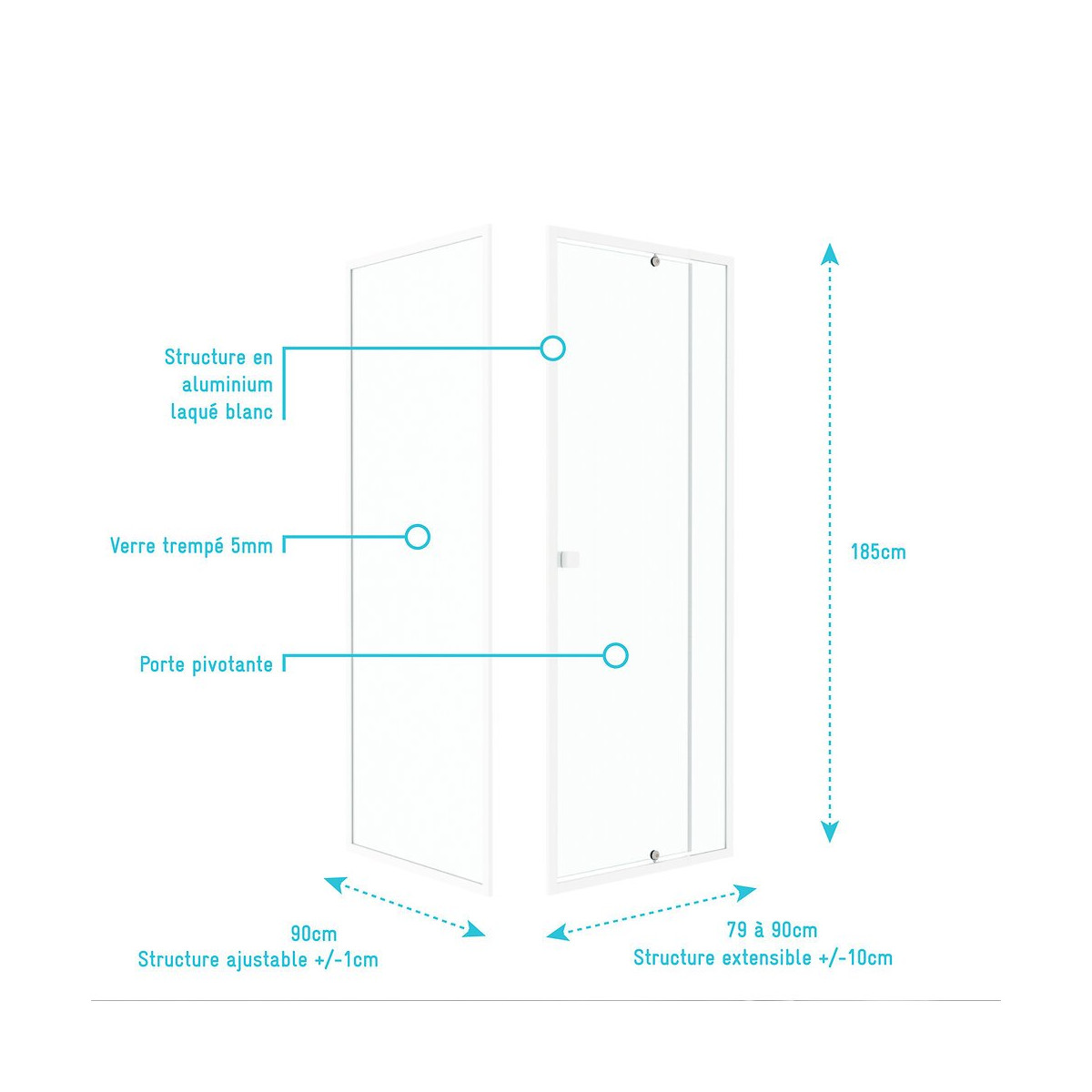 Caractéristiques de la porte de douche : Verre trempé 5mm transparent Structure en aluminium laqué blanc Poignées carrées blanche Pivot blanc Fermeture magnétique Montage réversible Dimensions 79-90x185 cm Plus produit : Profilés ajustables pour s'adapter à un maximum de surface La simplicité oui mais avec style Caractéristiques de la paroi de retour: Verre trempé 5mm transparent Structure en aluminium laqué blanc Ajustable +/- 1cm Dimensions 90X185 cm Réference du produit: PACF027 Désignation du produit: WHITY PIVOT Garantie 2 ans pièces et non main d'oeuvre. Verre trempé : Le verre trempé est un verre qui a subi un traitement afin d’améliorer ses propriétés. Nous utilisons la trempe thermique qui consiste à porter le verre à très haute température (environ à 700 °C), puis de le refroidir rapidement. Ce processus favorise l'apparition de tensions en profondeur et celle de la compression à la surface du verre. Tout cela a pour effet l’amélioration de sa résistance aux chocs. Il est de 2 à 5 fois plus résistant que le verre simple. Mais aussi diminue grandement la dangerosité du verre car en cas de casse le verre explose en de petits morceaux et non pas en de grands pans tranchants. Pour le reste il conserve les mêmes propriétés que le verre classique Norme harmonisée : EN14428:2004 Certification Européenne: Aptitude au nettoyage : EN14428 :2004+A1:2008 Clause 4.2 Résistance à l’impact / Propriétés d’éclatement: EN14428:2004+A1:2008 Clause 4.3 Durabilité : EN14428:2004+A1:2008 Clause 4.4 MyShowerRoom c’est aussi la garantie de durabilité : Nous garantissons un stocks de pièces détachées d’au moins 5 ans Notre visserie est en acier inoxydable ce qui est une garantie anticorrosion Garantie 2 ans pièces uniquement Cocorico ! MyShowerRoom est une entreprise Française et toute la conception de nos produits est également Française. Ce qui est un véritable plus pour être au plus près de ses clients et avoir une meilleure connaissance de leurs attentes. Qui sommes nous L’HISTOIRE DE MYSHOWERROOM Nous avons créé MyShowerRoom en 2003 avec l’ambition de démocratiser le design et l’innovation dans la salle de bain pour faire de cette pièce un lieu à part entière, un véritable lieu d’histoires à vivre pour toute la famille. Nos cabines de douche et meubles de salle de bain dans l’ère du temps à des tarifs très accessibles. Nos nombreux brevets garantissent l’originalité de notre gamme de cabines de douches. Et nos ingénieurs mettent en œuvre tout leur savoir-faire et toutes les technologies innovantes au service d’une simplicité d’installation et d’utilisation incomparable pour tous. ÊTRE BIENVEILLANT AVEC NOS CLIENTS Notre service client a un objectif : rendre nos clients heureux. Pour cela nous veillons à répondre dans les 24h aux demandes clients. Mais aussi de toujours apporter une solution et entière satisfaction à nos clients. CONSTRUIRE DES PRODUITS TOUJOURS PLUS PERFORMANTS Nos ingénieurs, ainsi que nos équipes terrain consacrent tous leurs efforts à créer des produits adaptés à vos besoins, et toujours plus innovants grâce à nos technologies. Notre objectif est d’être votre unique interlocuteur pour tous vos projets de salle de bain. CONCRÉTISER LES RÊVES DE CHACUN Un projet de salle de bain ? Nous le réalisons ! Lieu de détente et de relaxation par excellence, la salle de bain est une des pièces maîtresse de la maison. Chez MyShowerRoom, nous mettons tout en oeuvre afin que ce rêve devienne réalité. PROPOSER UNE GAMME COMPLÈTE DE PRODUITS Nous vous proposons grâce à notre boutique en ligne une gamme complète de produits Made in MyShowerRoom pour équiper, et accessoiriser votre salle de bain. Un catalogue que nous renouvelons régulièrement avec les dernières technologies MyShowerRoom. APPORTER UNE EXPERTISE HUMAINE Parce que l’humain passe avant tout, nous travaillons avec les meilleurs experts. La satisfaction de nos clients est notre seule et unique priorité. Chaque problème a une solution, et c’est dans cette optique que nous avons mis en place un chat pour échanger directement avec nos équipes. NOTRE CENTRE LOGISTIQUE 11 000 m² d’entrepôt 7000 palettes en stock 1 800 colis traités par jour Plus de 260 préparations de commandes quotidiennes 12 quais de chargement/déchargement CONSEILS & VENTES Une équipe disponible 5 jours sur 7 pour vous accompagner dans vos achats. LIVRAISON GRATUITE Pour toute commande sur le site MyShowerRoom, la livraison est gratuite dans toute la France. UNE GARANTIE DE QUALITÉ Grâce à nos produits brevetés vous bénéficiez de produits uniques. Référence produit: PACF027 Retrouvez plus d'informations produit et des conseils de montage sur le site Aurlane. Remarques importantes: Ces colis sont volumineux, la livraison est effectuée par transporteur spécialisé en bas de chez vous. Les chauffeurs ne sont pas habilités à porter la marchandise, mais uniquement à la décharger. Pas de livraison à l'étage. L'adresse de livraison doit être accessible en camion poids lourd. Dans le cas contraire la marchandise sera mise à disposition au dépôt le plus proche (distance non garantie). Les rendez-vous sont gérés directement par les transporteurs. Attention à bien contrôler la marchandise à réception pour éviter tous litiges.