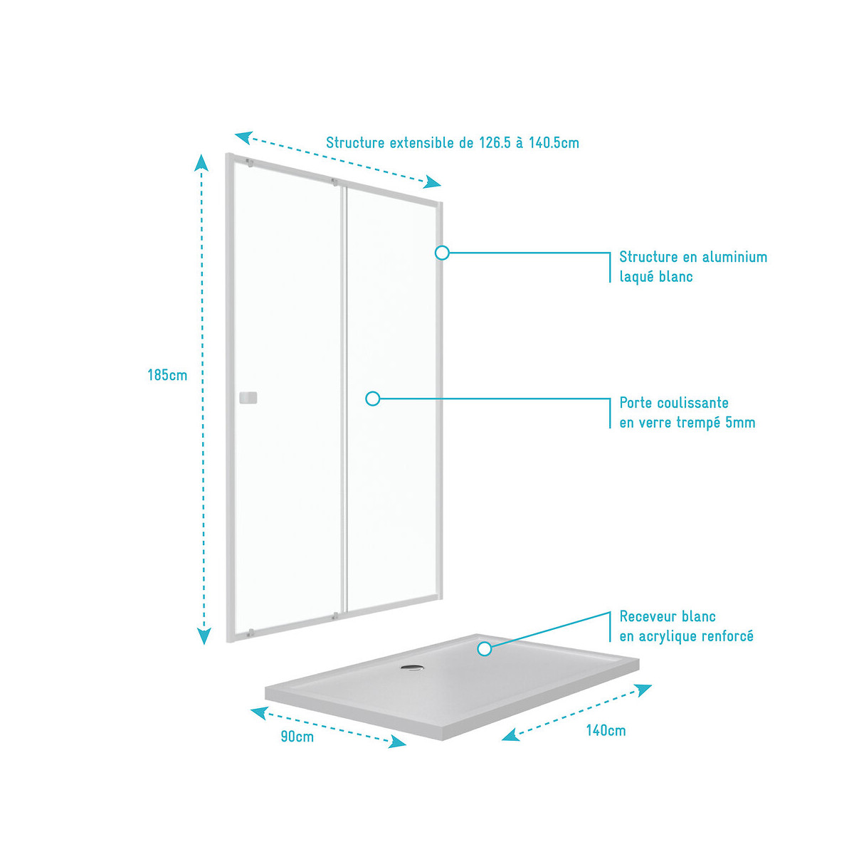 Caractéristiques de la portes : Structure en aluminium laqué blanc Porte coulissante en verre trempé 5mm Receveur blanc en acrylique renforcé . Structure extensible de 126.5cm à 140.5cm Dimensions : Portes coulissantes : 140x190 cm Receveur : 90x140 cm Plus produit : Profilés ajustables pour s'adapter à un maximum de surface La simplicité oui mais avec style Réference du produit: PACF041 Désignation du produit: WHITY SLIDE Garantie 2 ans pièces et non main d'oeuvre. Verre trempé : Le verre trempé est un verre qui a subi un traitement afin d’améliorer ses propriétés. Nous utilisons la trempe thermique qui consiste à porter le verre à très haute température (environ à 700 °C), puis de le refroidir rapidement. Ce processus favorise l'apparition de tensions en profondeur et celle de la compression à la surface du verre. Tout cela a pour effet l’amélioration de sa résistance aux chocs. Il est de 2 à 5 fois plus résistant que le verre simple. Mais aussi diminue grandement la dangerosité du verre car en cas de casse le verre explose en de petits morceaux et non pas en de grands pans tranchants. Pour le reste il conserve les mêmes propriétés que le verre classique Norme harmonisée : EN14428:2004 Certification Européenne: Aptitude au nettoyage : EN14428 :2004+A1:2008 Clause 4.2 Résistance à l’impact / Propriétés d’éclatement: EN14428:2004+A1:2008 Clause 4.3 Durabilité : EN14428:2004+A1:2008 Clause 4.4 MyShowerRoom c’est aussi la garantie de durabilité : Nous garantissons un stocks de pièces détachées d’au moins 5 ans Notre visserie est en acier inoxydable ce qui est une garantie anticorrosion Garantie 2 ans pièces uniquement Cocorico ! MyShowerRoom est une entreprise Française et toute la conception de nos produits est également Française. Ce qui est un véritable plus pour être au plus près de ses clients et avoir une meilleure connaissance de leurs attentes. Qui sommes nous L’HISTOIRE DE MYSHOWERROOM Nous avons créé MyShowerRoom en 2003 avec l’ambition de démocratiser le design et l’innovation dans la salle de bain pour faire de cette pièce un lieu à part entière, un véritable lieu d’histoires à vivre pour toute la famille. Nos cabines de douche et meubles de salle de bain dans l’ère du temps à des tarifs très accessibles. Nos nombreux brevets garantissent l’originalité de notre gamme de cabines de douches. Et nos ingénieurs mettent en œuvre tout leur savoir-faire et toutes les technologies innovantes au service d’une simplicité d’installation et d’utilisation incomparable pour tous. ÊTRE BIENVEILLANT AVEC NOS CLIENTS Notre service client a un objectif : rendre nos clients heureux. Pour cela nous veillons à répondre dans les 24h aux demandes clients. Mais aussi de toujours apporter une solution et entière satisfaction à nos clients. CONSTRUIRE DES PRODUITS TOUJOURS PLUS PERFORMANTS Nos ingénieurs, ainsi que nos équipes terrain consacrent tous leurs efforts à créer des produits adaptés à vos besoins, et toujours plus innovants grâce à nos technologies. Notre objectif est d’être votre unique interlocuteur pour tous vos projets de salle de bain. CONCRÉTISER LES RÊVES DE CHACUN Un projet de salle de bain ? Nous le réalisons ! Lieu de détente et de relaxation par excellence, la salle de bain est une des pièces maîtresse de la maison. Chez MyShowerRoom, nous mettons tout en oeuvre afin que ce rêve devienne réalité. PROPOSER UNE GAMME COMPLÈTE DE PRODUITS Nous vous proposons grâce à notre boutique en ligne une gamme complète de produits Made in MyShowerRoom pour équiper, et accessoiriser votre salle de bain. Un catalogue que nous renouvelons régulièrement avec les dernières technologies MyShowerRoom. APPORTER UNE EXPERTISE HUMAINE Parce que l’humain passe avant tout, nous travaillons avec les meilleurs experts. La satisfaction de nos clients est notre seule et unique priorité. Chaque problème a une solution, et c’est dans cette optique que nous avons mis en place un chat pour échanger directement avec nos équipes. NOTRE CENTRE LOGISTIQUE 11 000 m² d’entrepôt 7000 palettes en stock 1 800 colis traités par jour Plus de 260 préparations de commandes quotidiennes 12 quais de chargement/déchargement CONSEILS & VENTES Une équipe disponible 5 jours sur 7 pour vous accompagner dans vos achats. LIVRAISON GRATUITE Pour toute commande sur le site MyShowerRoom, la livraison est gratuite dans toute la France. UNE GARANTIE DE QUALITÉ Grâce à nos produits brevetés vous bénéficiez de produits uniques. Référence produit: PACF041 Retrouvez plus d'informations produit et des conseils de montage sur le site Aurlane. Remarques importantes: Ces colis sont volumineux, la livraison est effectuée par transporteur spécialisé en bas de chez vous. Les chauffeurs ne sont pas habilités à porter la marchandise, mais uniquement à la décharger. Pas de livraison à l'étage. L'adresse de livraison doit être accessible en camion poids lourd. Dans le cas contraire la marchandise sera mise à disposition au dépôt le plus proche (distance non garantie). Les rendez-vous sont gérés directement par les transporteurs. Attention à bien contrôler la marchandise à réception pour éviter tous litiges.