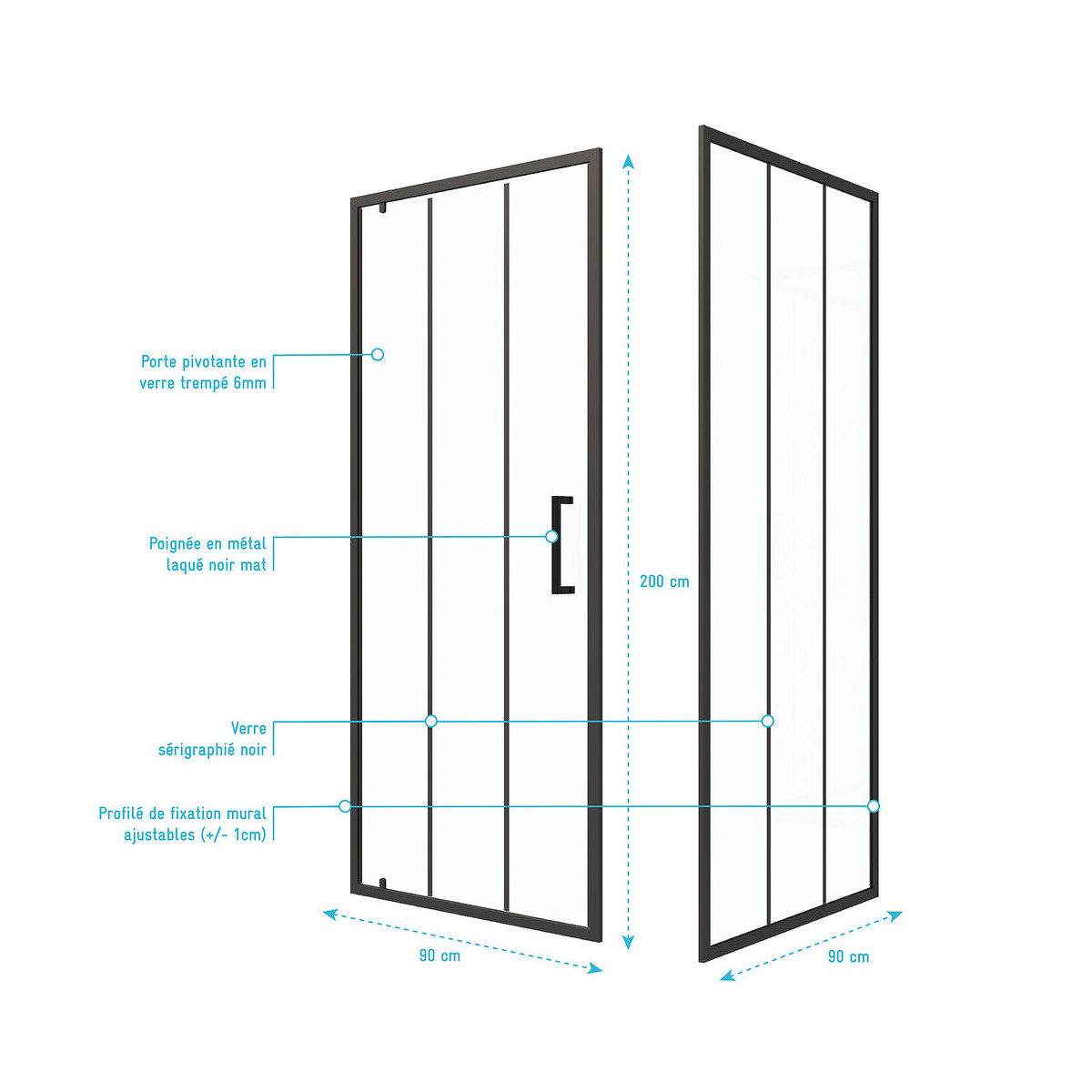 PACK Porte de douche pivotante CRUSHX PIVOT 90 + paroi de retour CRUSHX RETOUR 90 Caractéristique des portes : Porte coulissante en verre trempé 6mm Poignée en métal laqué noir mat Verre sérigraphié noir Profilé de fixation mural ajustable (+/-1cm) Dimensions de la porte coulissante : 90x200 cm Dimensions de la porte de retour : 90x200 cm Référence : PACF018 Désignation du produit: CRUSHX PIVOT + CRUSHX RETOUR Garantie 2 ans pièces et non main d'oeuvre. Profilé noir mat thermolaqué : Le thermolaquage est une technique de traitement spécifique réservé aux matériaux en métal ou en aluminium brut. On projette de la peinture en poudre chargée en électricité statique qui va se déposer sur toute la surface des profilés. Cette technique de pulvérisation en poudre , qui s’appelle projection électrostatique ou poudrage électrostatique, permet d'avoir un revêtement complètement uniforme sur tous les profilés. Ce type de traitement dispense l’utilisation de produits chimiques nocifs pour la santé et l’environnement comme les solvants. Après avoir été recouverte de poudre, la pièce doit passer dans un four où elle sera chauffée pendant 20 minutes à 200°C. Les avantages du thermolaquage : Cette technique possède de nombreux avantage, qui sont La surface peinte possède une dureté supérieure ce qui a pour conséquence une résistance aux chocs accrue Le thermolaquage a une meilleure résistance à la corrosion La couleur des profilés thermolaqués résiste mieux au vieillisement et tout autres élément tel que l'humidité etc. Les profilés thermolaqués présentent une meilleure finition, fini les coulures de peinture et défauts d'aspect, avec cette technique la surface est uniforme Sans solvant c'est un véritable plus pour la santé Mais aussi plus écologique (pas de solvants) Dans un souci de qualité mais aussi de sécurité nos produits répondent à toutes les normes Européennes en vigeur. Que ce soit en terme de sécurité en cas de casse, d'entretien de nos produits ou de la durée de vie de ces derniers, nos produits remplissent tous les critères. Verre trempé : Le verre trempé est un verre qui a subi un traitement afin d’améliorer ses propriétés. Nous utilisons la trempe thermique qui consiste à porter le verre à très haute température (environ à 700 °C), puis de le refroidir rapidement. Ce processus favorise l'apparition de tensions en profondeur et celle de la compression à la surface du verre. Tout cela a pour effet l’amélioration de sa résistance aux chocs. Il est de 2 à 5 fois plus résistant que le verre simple. Mais aussi diminue grandement la dangerosité du verre car en cas de casse le verre explose en de petits morceaux et non pas en de grands pans tranchants. Pour le reste il conserve les mêmes propriétés que le verre classique Norme harmonisée : EN14428:2004 Certification Européenne: Aptitude au nettoyage : EN14428 :2004+A1:2008 Clause 4.2 Résistance à l’impact / Propriétés d’éclatement: EN14428:2004+A1:2008 Clause 4.3 Durabilité : EN14428:2004+A1:2008 Clause 4.4 MyShowerRoom c’est aussi la garantie de durabilité : Nous garantissons un stocks de pièces détachées d’au moins 5 ans Notre visserie est en acier inoxydable ce qui est une garantie anticorrosion Garantie 2 ans pièces uniquement Cocorico ! MyShowerRoom est une entreprise Française et toute la conception de nos produits est également Française. Ce qui est un véritable plus pour être au plus près de ses clients et avoir une meilleure connaissance de leurs attentes. Qui sommes nous L’HISTOIRE DE MYSHOWERROOM Nous avons créé MyShowerRoom en 2003 avec l’ambition de démocratiser le design et l’innovation dans la salle de bain pour faire de cette pièce un lieu à part entière, un véritable lieu d’histoires à vivre pour toute la famille. Nos cabines de douche et meubles de salle de bain dans l’ère du temps à des tarifs très accessibles. Nos nombreux brevets garantissent l’originalité de notre gamme de cabines de douches. Et nos ingénieurs mettent en œuvre tout leur savoir-faire et toutes les technologies innovantes au service d’une simplicité d’installation et d’utilisation incomparable pour tous. ÊTRE BIENVEILLANT AVEC NOS CLIENTS Notre service client a un objectif : rendre nos clients heureux. Pour cela nous veillons à répondre dans les 24h aux demandes clients. Mais aussi de toujours apporter une solution et entière satisfaction à nos clients. CONSTRUIRE DES PRODUITS TOUJOURS PLUS PERFORMANTS Nos ingénieurs, ainsi que nos équipes terrain consacrent tous leurs efforts à créer des produits adaptés à vos besoins, et toujours plus innovants grâce à nos technologies. Notre objectif est d’être votre unique interlocuteur pour tous vos projets de salle de bain. CONCRÉTISER LES RÊVES DE CHACUN Un projet de salle de bain ? Nous le réalisons ! Lieu de détente et de relaxation par excellence, la salle de bain est une des pièces maîtresse de la maison. Chez MyShowerRoom, nous mettons tout en oeuvre afin que ce rêve devienne réalité. PROPOSER UNE GAMME COMPLÈTE DE PRODUITS Nous vous proposons grâce à notre boutique en ligne une gamme complète de produits Made in MyShowerRoom pour équiper, et accessoiriser votre salle de bain. Un catalogue que nous renouvelons régulièrement avec les dernières technologies MyShowerRoom. APPORTER UNE EXPERTISE HUMAINE Parce que l’humain passe avant tout, nous travaillons avec les meilleurs experts. La satisfaction de nos clients est notre seule et unique priorité. Chaque problème a une solution, et c’est dans cette optique que nous avons mis en place un chat pour échanger directement avec nos équipes. NOTRE CENTRE LOGISTIQUE 11 000 m² d’entrepôt 7000 palettes en stock 1 800 colis traités par jour Plus de 260 préparations de commandes quotidiennes 12 quais de chargement/déchargement CONSEILS & VENTES Une équipe disponible 5 jours