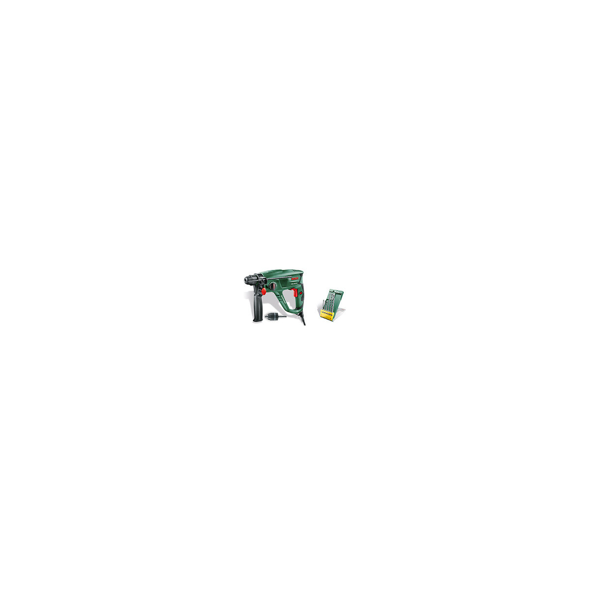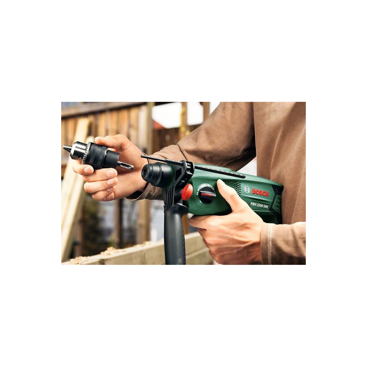 Marteau perforateur PBH 2500 SRE : puissant, maniable et léger avec mandrin adaptateur et set d'accessoires. Perforation sans effort dans le béton et la maçonnerie, burinage, perçage et vissage avec une puissance de 600 W. Puissance record : mécanisme de frappe pneumatique Bosch doté d'une puissance de frappe de 1,9 J : puissance de frappe élevée dans les matériaux durs, indépendamment de la pression appliquée. Ergonomie poussée : faible poids 2,2 kg), design compact Slimline) et poignée Softgrip pour un travail sans effort. Un outil polyvalent : fourni avec un set d'accessoires et un mandrin adaptateur pour forets et embouts de vissage usuels. Système SDS-plus Bosch : changement rapide et sans outil de l'accessoire. Fonction de burinage intégrée avec Vario-Lock : position de travail du burin variable. Stop de frappe pour percer dans les métaux et dans le bois. La gâchette permet de faire varier la vitesse du régulateur électronique Bosch de 0 au maximum. Mandrin adaptateur SDS Bosch 1 618 571 014). Caractéristiques techniques : Puissance : 600 W. Régime à vide : 2000 tr/min. Fréquence de frappe : 5 000 coups/min. Diamètre de perçage max béton/acier/bois : 22/13/30. Poids : 2,2 kg. Livré avec : Butée de profondeur, set 6 forets.Spécifications techniques