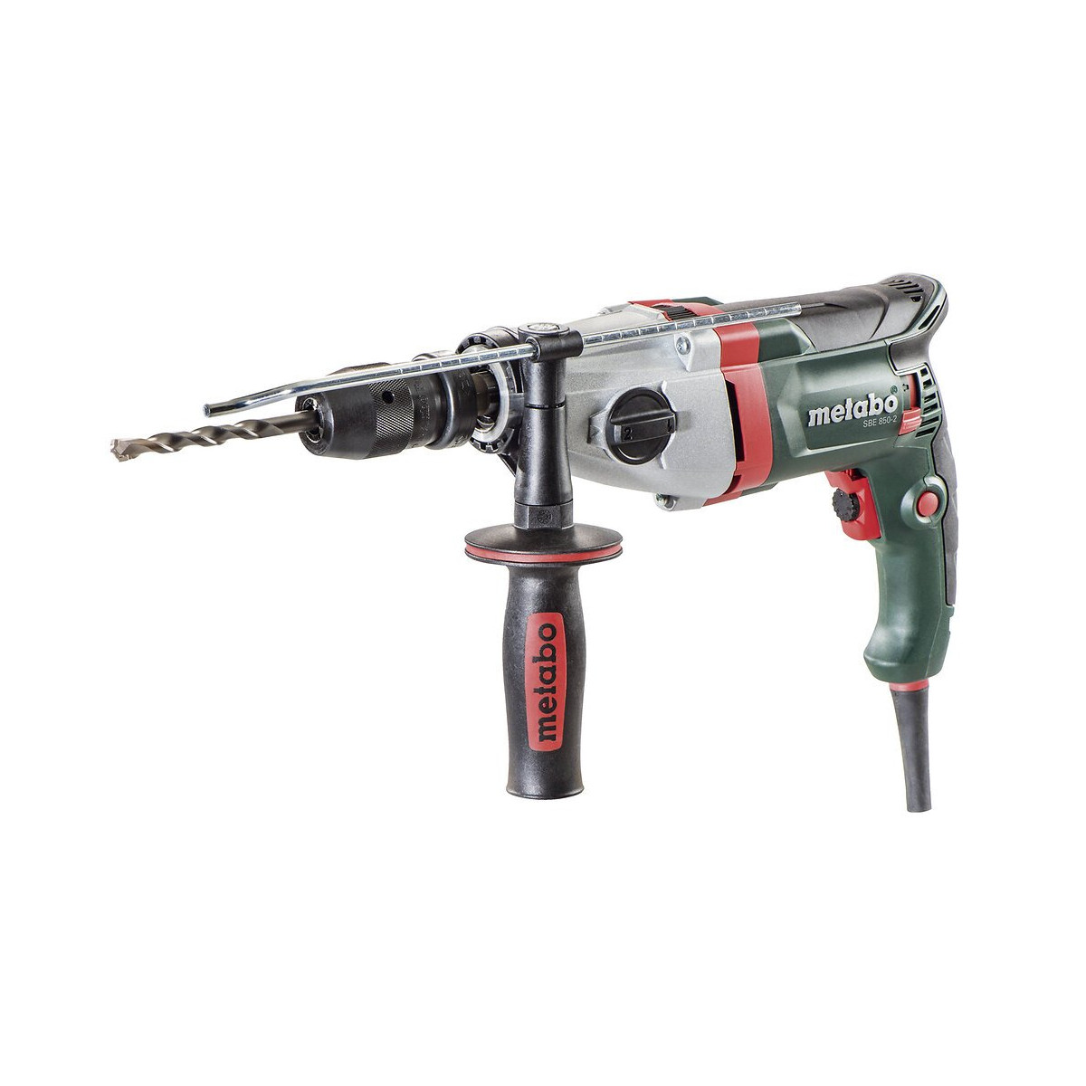 DESCRIPTION = Système électronique Vario (V) pour travailler avec des vitesses adaptées aux matériaux. Molette pour la présélection de la vitesse de rotation. Carter de réduction robuste en fonte d'aluminium moulée sous pression pour une dissipation de la chaleur et une longévité optimales. Balais autorupteurs rotatifs pour une puissance maximale, même en rotation à gauche, par exemple pour dévisser des vis bloquées. Moteur Metabo Marathon avec protection contre la poussière pour une longévité élevée. Débrayage de sécurité Metabo S-automatic : débrayage automatique de l'entraînement en cas de blocage de l'outil pour travailler en toute sécurité. Réversible droite/gauche. Broche à six pans creux pour embouts de vissage pour travailler sans mandrin. Câble avec rotule pour une grande liberté de mouvement au travail. VALEURS TECHNIQUES = Puissance absorbée nominale : 850W - Puissance utile : 490W - Couple de rotation max. : 36 / 14 N.m - Ø de perçage dans la maçonnerie : 20 mm - Ø de perçage dans le béton : 18 mm - Ø de perçage dans l’acier : 13/8 mm - Ø de perçage dans le bois tendre : 40/25 mm - Vitesse de rotation à vide : 0-1100/0-3100 /min - Vitesse de rotation en charge nominale : 640/1800/min - Cadence de frappe max. : 58900/min - Vitesses : 2 - Ouverture de mandrin : 1,5-13 mm - Diamètre du collier de serrage : 43 mm - Broche de perçage à six pans creux : 6,35 mm - Filet de broche de perçage : 1/2"-20 UNF - Type de serrage du mandrin : mandrins à serrage rapide - Poids sans câble : 2,6 kg - Long. de câble : 4 m / VIBRATIONS = Perçage du métal : 4,2 m/s² - Incertitude de mesure K : 1,5 m/s² - Perçage à percussion dans le béton : 17 m/s² - Incertitude de mesure K : 1,5 m/s² / EMISSION ACOUSTIQUE = Niveau sonore : 103 dB(A) - Niveau de puissance acoustique (LwA) : 114 dB(A) - Incert. de mesure K : 3 dB(A) EQUIPEMENT STANDARD = Mandrin à serrage rapide Futuro Plus, poignée caoutchoutée supplémentaire, butée de profondeur de perçage, metaBOX 145l.Spécifications techniques