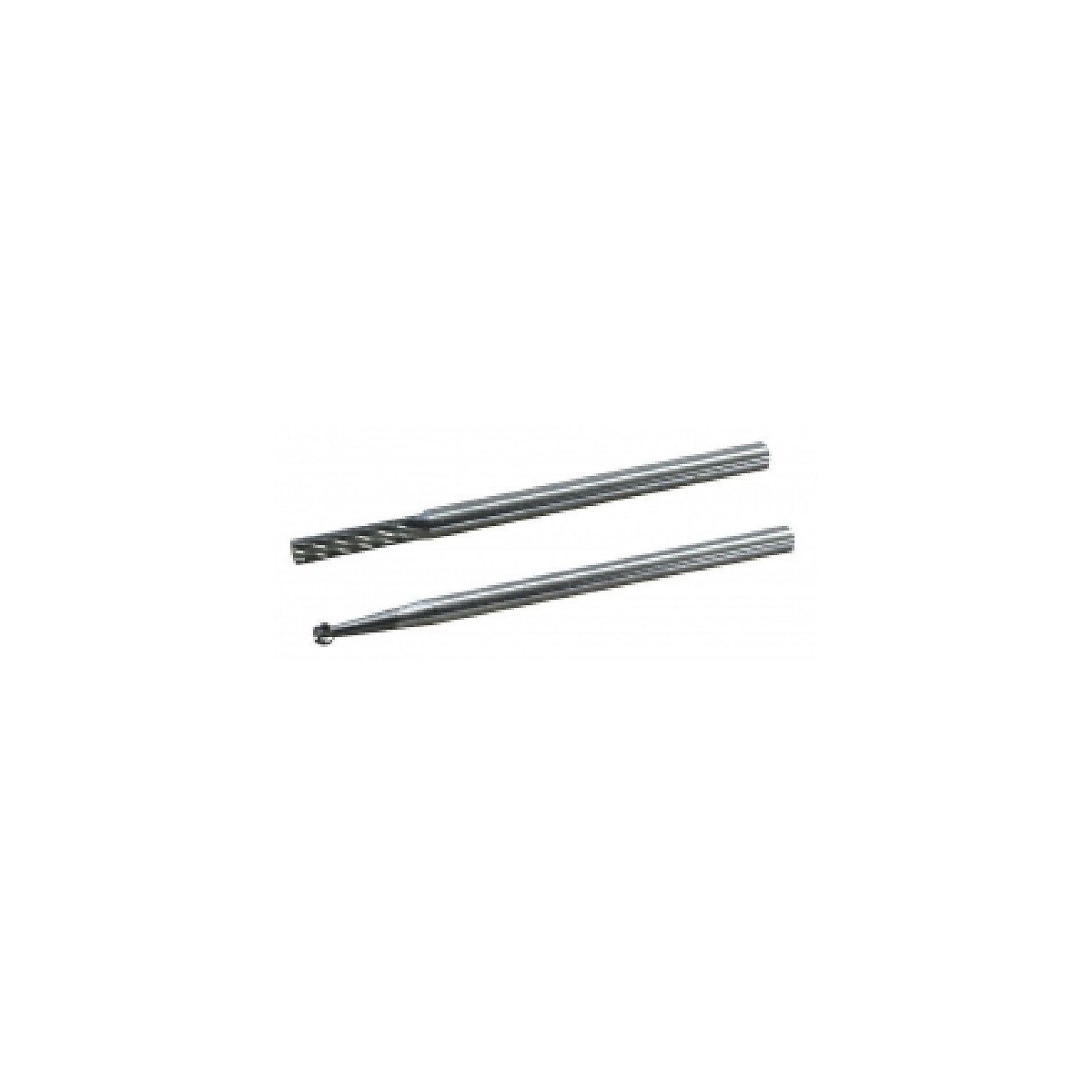 2 fraises au carbure de tungstène. Forme : sphérique, diamètres : 1,0 / 1,8 mm. Denture fine, pour façonner et décaper l’acier, le fer forgé, les métaux non ferreux, le plastique, le bois dur et autres matériaux durs. Pour un fraisage sans vibration de grande précision.
