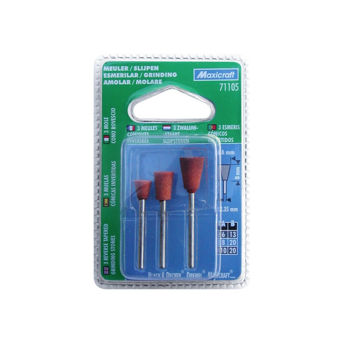3 meules corindon, de forme conique. Diamètres : 6 / 8 / 10 mm. Pour aiguiser, ébarber, rectifier la plupart des métaux et la porcelaine. Tige Ø 2,35 mm.