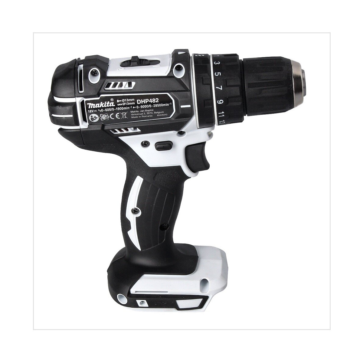 Contenu de la livraison: - 1x Makita DHP 482 ZW Perceuse-visseuse à percussion sans fil 18 V Li-Ion Description du produit: La perceuse / visseuse à percussion Makita DHP 482 W avec engrenage planétaire à 2 vitesses avec engrenages métalliques et un puissant moteur à courant continu à 4 pôles a un couple de 21 fois plus un niveau de perçage supplémentaire et une fonction d'impact. La technologie XPT (eXtreme Protection Technology) protège la machine de la poussière et des projections d'eau, ce qui augmente sensiblement la durée de vie du tournevis. De plus, le marteau perforateur impressionne par sa lumière LED intégrée pour éclairer la zone de travail, le frein moteur électronique et le mandrin sans clé de 13 mm. Spécifications: Régime de ralenti 1ère vitesse: 0-600 tr/min Régime de ralenti 2e vitesse: 0-1900 tr/min Régime de ralenti de 1ère vitesse: 0-9000 tr/min Régime de ralenti de 2e vitesse: 0-28500 tr/min Capacité de perçage dans le bois: 38 mm Capacité de perçage dans l'acier: 13 mm Capacité de perçage dans la maçonnerie: 13 mm Couple souple: 36 Nm Couple dur: 62 Nm Envergure du mandrin: 1,5 - 13 mm Tension de la batterie: 18 V Dimensions (LxPxH): 198x79x249 mm Poids sans batterie: 1,5 kg