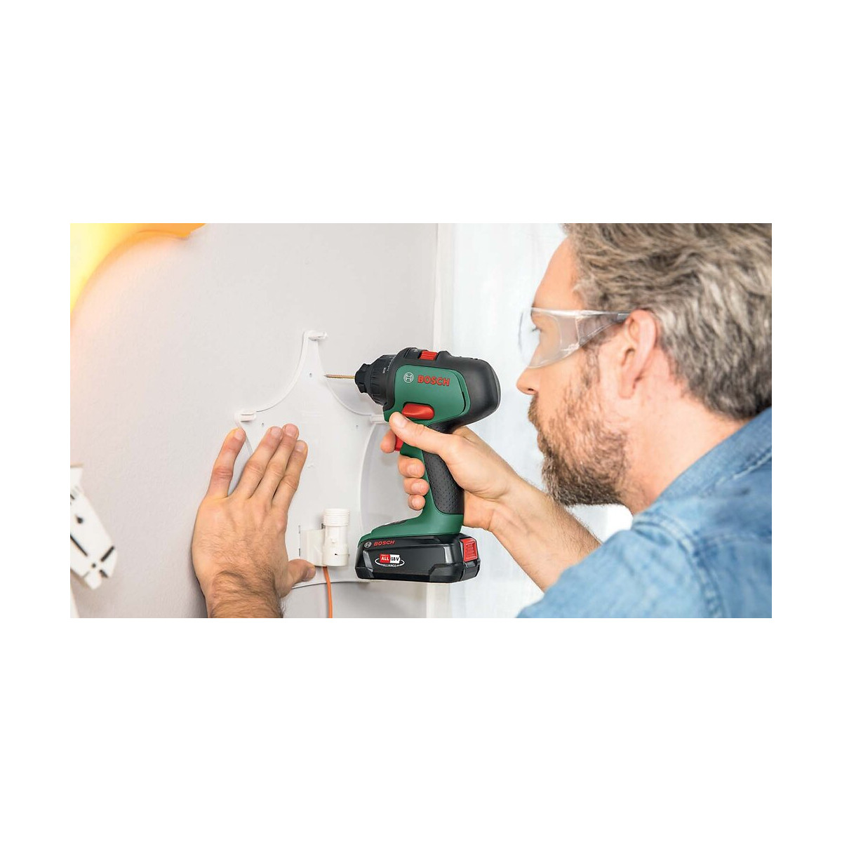 Commutateur électronique innovant, le sens de rotation de la machine est inversé par voie électronique. Utilisation facile: sélection intuitive novatrice de vitesse. La vitesse de la machine est adaptée automatiquement au mode sélectionné par l'utilisateur (forer/visser/perforer). Power for All: Une seule batterie de 18V interchangeable pour tous vos outils sans fil en lithium. Pratique et économique ! Raccord pour accessoires QuickSnap qui permettent de visser, forer et perforer. Rangement simple des accessoires grâce au garage à embouts / vis. Anti Kickback Sensor pour provoquer l’arrêt immédiat de l’outil en cas de blocage. Performances optimales et autonomie maximale grâce à la puce Syneon. Livré avec : 1 outil, coffret, 1 batterie 18V 2,5 Ah, 1 embout, 1 mandrin, chargeur 45 min, porte-vis magnétiqueSpécifications techniques