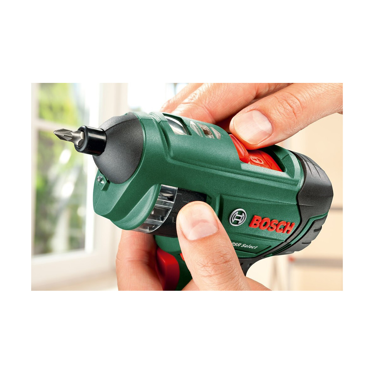Visseuse sans fil Lithium-Ion PSR Select : le bon embout de vissage toujours à portée de main. - Barillet d'embouts intégré : le barillet rotatif contient les 12 embouts de vissage les plus courants. - Système EasySelect Bosch innovant : fonction Select intuitive et facile à utiliser permettant de changer d'embout très rapidement. - Indicateur embout éclairé : permet de sélectionner les différents embouts de vissage facilement et rapidement. - Batterie Lithium-Ion : absence d'effet mémoire et d'autodécharge, disponibilité permanente. - Endurante : jusqu'à 90 vis par charge complète. - Forme compacte pour une bonne maniabilité et une maîtrise parfaite des vissages. - Eclairage PowerLight – La diode intégrée éclaire la pièce à usiner pour que vous l'ayez toujours bien en vue. - Indicateur du sens de rotation et de l'état de charge par LED. - Blocage de broche automatique pour serrage ou desserrage manuel des vis. - Revêtement Softgrip pour une prise en main sûre et agréable. , Livré avec : Coffret plastique, 12 embouts de vissage standards, Chargeur 5 ,h. Ø de vissage maxi. : 5 mm Tension de la batterie : 3.6 V Régime à vide : 210 tr/min Couple maxi. vissage tendre/dur: 3,5 / 4,5 Nm Temps de charge : 4 H Mandrin de perçage: Porte-embout magnétique avec tige six pansSpécifications techniques