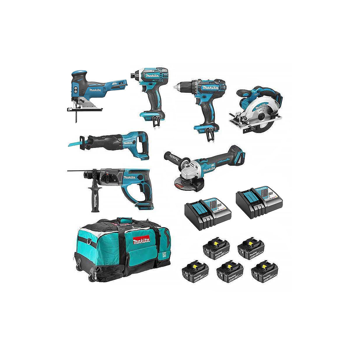Avantages Pack exclusif 7 outils MAKITA DLX7013PT1-B 18V (5x5Ah) DDF482 - Perceuse visseuse Ø 13 mm Perceuse Visseuse rapide et compacte pour travaux courants Technologie XPT limitant les infiltrations d'eau et poussières Protection des batteries contre la surcharge/décharge profonde/surchauffe Pignonerie entièrement métallique Double éclairage LED intégré pour un travail plus aisé dans les endroits sombres DGA504 - Meuleuse Ø 125 mm Meuleuse à batterie 125 mm, puissante, performante et maniable. Contrôle automatique de la vitesse en fonction de la charge appliquée assurant un meulage optimal. Moteur sans charbon : Puissant, Performant, Compact et Léger Démarrage progressif assurant un démarrage en douceur de la machine (sans à-coups) pour plus de sécurité. Technologie XPT limitant les infiltrations d'eau et poussières DHR202 - Perfo-burineur SDS-Plus 20 mm 3 fonctions : perçage, perforation et burinage Force de frappe equivalente aux machines filaires Conçu pour une durabilité extrême dans les conditions les plus éprouvantes Poignée latérale caoutchoutée orientable sur 360° avec butée de profondeur Débrayage de sécurité protégeant le moteur ainsi que l'utilisateur en cas de blocage de l'outil DJR186 - Scie récipro Nouveau système d'entraînement : augmente la course de la lame et le rendement. Nouveau système d'entraînement : réduit les déviations de la lame et les vibrations. Guidage de la tige plus robuste. Sabot renforcé et plus rigide. Technologie XPT limitant les infiltrations d'eau et poussières DJV181 - Scie sauteuse Moteur sans charbon 6 plages de réglages de la vitesse pour un travail optimal sur différents matériaux Système de changement de lame sans outils rapide et résistant Prise en main pommeau Machine dotée d'un mouvement pendulaire à 3 positions + 1 droite pour une coupe plus nette Fonction éclairage incorporée pour un travail plus aisé dans les endroits sombres Bouton de sécurité pour prévenir l'activation accidentelle de la gâchette Base en aluminium rigide inclinable à gauche et à droite à 45° pour une plus grande précision de coupe Axe de coupe à profil carré pour plus de précision dans les courbes DSS610 - Scie circulaire Ø 165 mm Lame positionnée à gauche pour une excellente visibilité du trait de coupe en utilisation à main droite Gâchette à deux pas permettant d'allumer l'éclairage sans démarrer la scie Jet d'air soufflant la sciure pour une meilleure visibilité du trait de coupe Base en aluminium avec repère du trait de coupe Machine légère et maniable à progression de coupe rapide grâce au régime élevé DTD152 - Visseuse à chocs 165 Nm Visseuse à chocs rapide et puissante pour travaux courants de vissage Technologie XPT limitant les infiltrations d'eau et poussières Inverseur de sens de rotation La vitesse variable à la gâchette assure un contrôle parfait de la machine en fonction du travail à effectuer Double éclairage LED intégré pour un travail plus aisé dans les endroits sombres Caractéristiques techniques Pack exclusif 7 outils MAKITA DLX7013PT1-B 18V (5x5Ah) Puissance Tension 18 V Batterie Composition chimique batterie Li-Ion Capacité de batterie 5 Ah Temps de charge en moyenne 45 min. Nombre de batteries fournies 5 DDF482 - Perceuse visseuse Ø 13 mm Tension 18 V Composition chimique batterie Li-Ion Nombre de vitesses 2 Vitesse à vide V1/V2 0 à 600 / 0 à 1900 tr/min Couple de serrage max. (élast/franc) 36 / 62 Nm Ø max. dans acier/bois 13 / 38 mm Dimensions (L x l x h) 185 x 79 x 249 mm Poids net EPTA 1,7 kg DGA504 - Meuleuse Ø 125 mm Tension 18 V Composition chimique batterie Li-Ion Circonférence ( prise en main ) 160 mm Vitesse à vide max. 8500 tr/min Diamètre du disque 125 mm Diamètre de l'alésage 22,23 mm Taux de vibration triaxial (ah) 6 m/s² Pression sonore (Lpa) 79 dB (A) Dimensions (L x l x h) 362 x 140 x 145 mm Poids net EPTA 2,5 kg DHR202 - Perfo-burineur SDS-Plus 20 mm Tension 18 V Composition chimique batterie Li-Ion Puissance de frappe (EPTA) 2 Joules Ø max. dans béton/acier/bois 20 / 13 / 26 mm Vibration 3ax burinage (ah) 11 m/s² Cadence de frappe max. 0 à 4000 cps/min Vitesse à vide max. 1200 tr/min Dimensions (L x l x h) 358 x 104 x 235 mm Poids net EPTA 3,5 kg DJR186 - Scie récipro Tension 18 V Composition chimique batterie Li-Ion Cadence de coupe maximale 2800 cps/min Longueur de course 32 mm Capacité de coupe (bois) 255 mm Capacité de coupe (tube acier) 130 mm Dimensions (L x l x h) 486 x 81 x 222 mm Poids net EPTA 3,5 kg DJV181 - Scie sauteuse Batterie Composition chimique batterie Li-Ion Tension de batterie 18 V Nombre de batteries fournies 0 Cadence Cadence de coupe maximale 800 à 3500 cps/min Amplitude du mouvement Longueur de course 26 mm Capacité de coupe Capacité de coupe (alu) 20 mm Capacité de coupe (bois) 135 mm Capacité de coupe (acier) 10 mm Niveaux d'exposition Vibration 3ax coupe de bois (ah) 6,5 m/s² Vibration 3ax coupe d'acier (ah) 5 m/s² Général Dimensions (L x l x h) 298 x 77 x 189 mm Poids net 2,5 kg DSS610 - Scie circulaire Ø 165 mm Tension 18 V Composition chimique batterie Li-Ion Hauteur de coupe max. à 90° 57 mm Hauteur de coupe max. à 45° 40 mm Vitesse à vide max. 3700 tr/min Diamètre de la lame 165 mm Diamètre de l'alésage 20 mm Dimensions (L x l x h) 347 x 202 x 228 mm Poids net EPTA 3,5 kg DTD152 - Visseuse à chocs 165 Nm Tension 18 V Composition chimique batterie Li-Ion Vitesse à vide max. 2900 tr/min Cadence de chocs 0 à 3500 cps/min Couple de serrage max. (franc) 165 Nm Dimensions (L x l x h) 138 x 79 x 238 mm Poids net EPTA 1,5 kg Accessoires 5 Batteries BL1850B (Li-ion 18V - 5Ah ) 2 chargeur simple RD18RC 1 Sac outillage à roulettes
