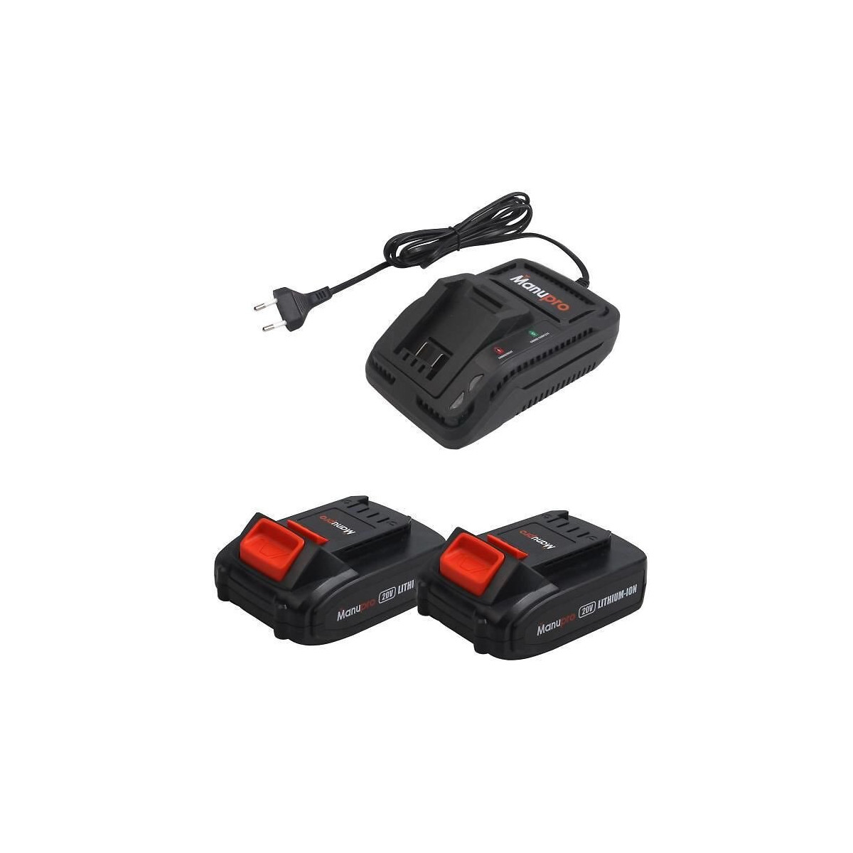 Manupro Perceuse visseuse sans fil - 2 batteries Lithium-Ion avec chargeur - Tension maximale: 20 V - Ampérage: 2 Ah - 2 vitesses - Vitesse variable : de 0 a 1650 tours/min - Réglage progressif de la vitesse - Force de serrage : 40 Nm - Mandrin auto-serrant sans clé 13 mm - Capacité de perçage acier/métal: 13 mm - Capacité de perçage bois: 30 mm - Eclairage LED - Indicateur lumineux du niveau de charge
