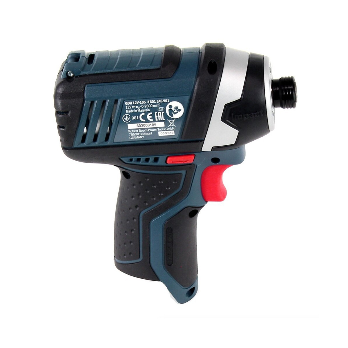 Visseuse à Chocs BOSCH GDR 12V-105 Professional - Avec 137 mm, elle est la plus compacte de la catégorie 12 V. Elle assure une prise en main optimale notamment lors des travaux de vissage en hauteur et dans les endroits difficiles d'accès - Couple remarquable (105 Nm) suffisant pour 80 % des applications courantes dans le métal et le béton - Résultats parfaits grâce à la présélection de vitesse pour les applications nécessitant une vitesse adaptée au matériau - Réversibilité gauche/droite pour visser et dévisser - Très bonne maniabilité de la visseuse grâce à sa poignée antidérapante Soft Grip - Eclairage LED intégré pour illuminer la zone de travail, même dans les coins sombres
