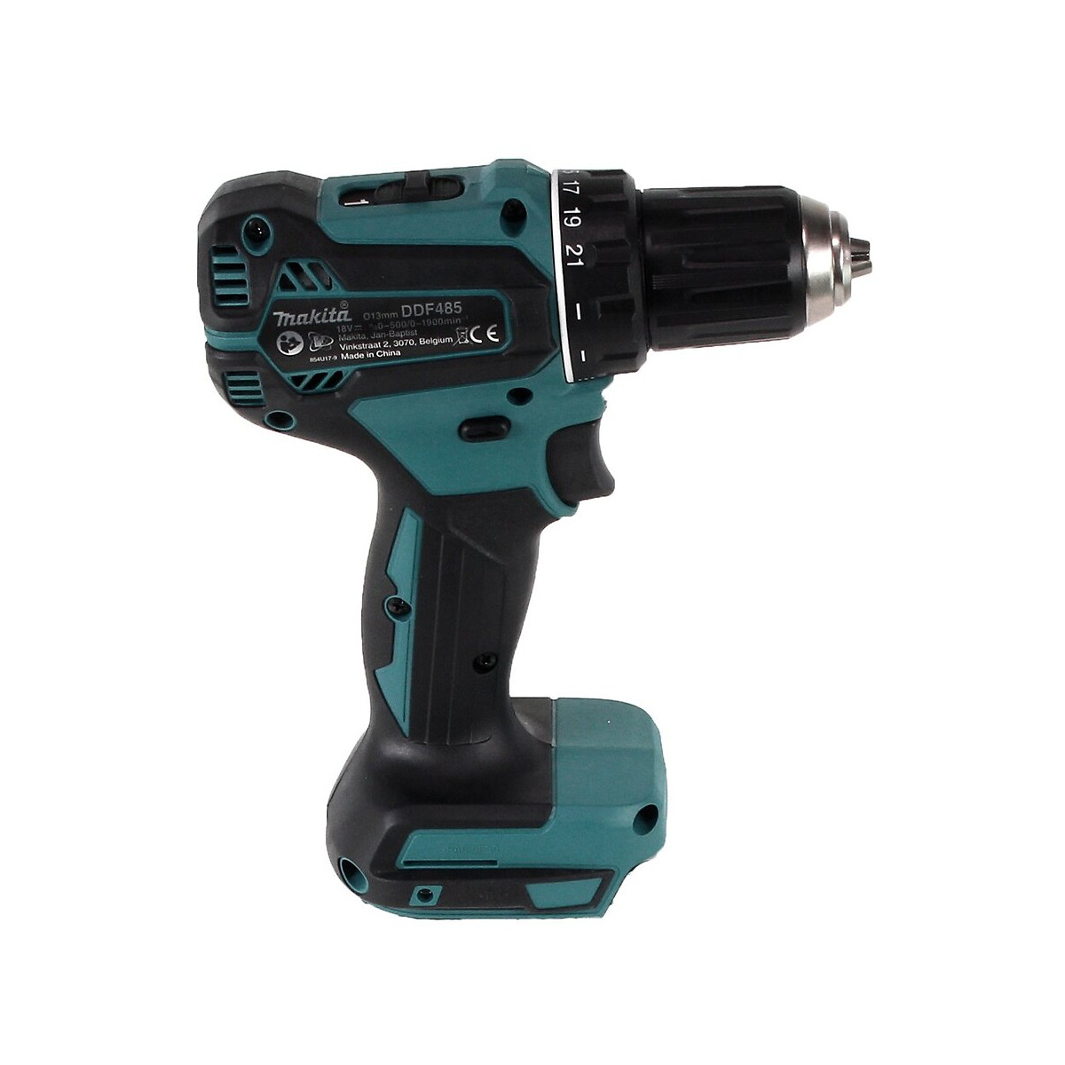 Contenu de la livraison: - 1x Makita DDF 485 Z Perceuse-visseuse sans fil 18V 50Nm - 1x Jeu d'embouts Wiha 31 pièces, Bitbox Dinotech Edition - sans batterie, sans chargeur Description du produit: Le Makita DDF 485 est une aide pratique pour une variété d'applications grâce à sa conception compacte. Différents outils peuvent être serrés avec le mandrin sans clé jusqu'à 13 mm. Les 21 niveaux de couple plus le niveau de perçage adaptent la perceuse / visseuse à la pièce à usiner respective. Grâce à la technologie sans balais sans usure et à l'engrenage planétaire entièrement métallique, le DDF 485 pratique offre un haut niveau d'endurance et de durabilité. La LED lumineuse fournit une vue d'ensemble lorsque vous travaillez. Avec le jeu d'embouts de 31 pièces Wiha au design moderne Dinotech inclus dans la livraison, le DDF 485 est idéalement équipé pour une grande variété de travaux. Spécifications techniques: Vitesse de ralenti 1ère vitesse: 0-500 tr/min Vitesse de ralenti 2e vitesse: 0-1900 tr/min Capacité de perçage dans le bois: 38 mm Capacité de perçage dans l'acier: 13 mm Couple doux: 27 Nm Couple dur: 50 Nm Gamme de mandrins de perçage: 1,5 - 13 mm Tension de la batterie: 18 V Dimensions (mm): 169 x 79 x 255 Poids: 1,4 kg