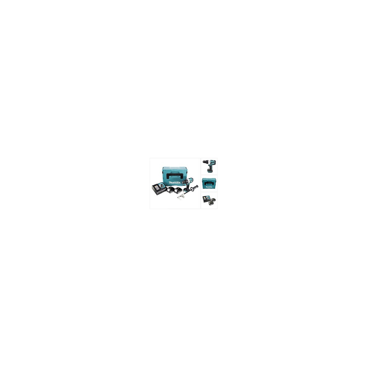 Contenu du paquet: - 1x Makita DDF 481 Perceuse visseuse sans fil 18V - 2x Batteries Li-Ion Makita BL1830 B 3,0Ah / 3.000mAh - 1x Chargeur Makita DC18RC 7,2 - 18 V - 1x Coffret de transport Makita Makpac 2 - 1x Poignée latérale Makita - 1x Insert en mousse pour Makita Makpac Description du produit: L'outil DDF 481 RFJ du constructeur Makita est une puissante perceuse visseuse sans fil au design très compact. Son puissant moteur sans balai impressionne par son fonctionnement à faible usure et sa longue durée de vie. La Makita DDF 481 est équipée d'une boîte de vitesses planétaire entièrement métallique à 2 vitesses et son couple peut être réglé de façon précise en 21 positions, plus une position de perçage, ce qui facilite son adaptation à toutes les applications. La perceuse visseuse sans fil DDF 481 RFJ de Makita dispose également d'un indicateur de niveau de charge de vos batteries Makita 18V et d'une LED qui assure l'éclairage de la zone de travail. Spécifications techniques: Vitesse à vide V1 : 0 - 550 min-1 Vitesse à vide V2 : 0 - 2.100 min-1 Capacité de perçage dans le bois : 76 mm Capacité de perçage dans l'acier : 13 mm Couple de serrage max. (souple): 60 Nm Couple de serrage max. (dur) : 115 Nm Plage de serrage du mandrin de perceuse : 1,5 - 13 mm Tension de la batterie : 18 V Dimensions (Longueur x Largeur x Hauteur ) : 205x79x266 mm Poids (sans batterie/manche latérale) : 1,78 kg