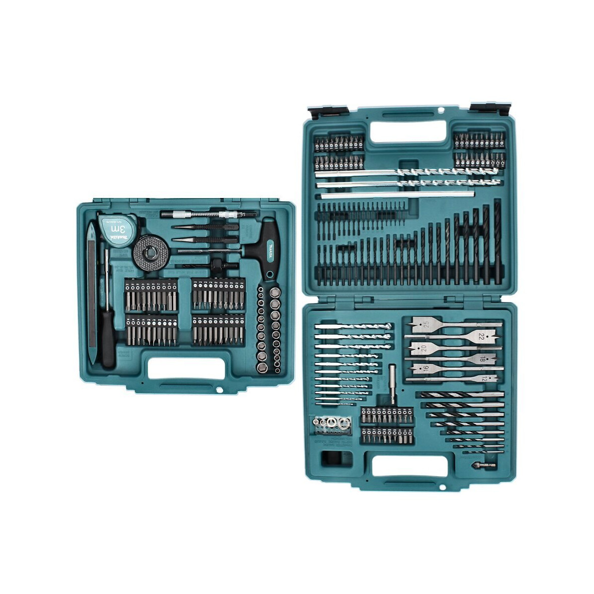 Contenu de la livraison: - 44x Forets métalliques HSS-R ( 5x 1,0 / 5x 1,5 / 5x 2,0 / 4x 2,5 / 5x 3,0 / 2x 3,2 / 4x 3,5 / 4x 4,0 / 1x 4,5 / 1x 5,0 / 1x 5,5 / 1x 6,0 / 1x 6,5 / 1x 7,0 / 1x 7,5 / 1x 8,0 / 1x 9,0 / 1x 10,0 mm ) - 13x Forets à pierre ( 3,0 / 4,0 / 4,0 / 5,0 / 5,5 / 6,0 / 6,5 / 7,0 / 8,0 / 9,0 / 10,0 / 8,0 x 300 / 10,0 x 300 mm ) - 8x Forets à bois ( 3 / 4 / 5 / 6 / 7 / 8 / 9 / 10 mm ) - 4x Limiteurs de profondeur de perçage ( 3 / 5 / 8 / 10 mm ) - 6x Forets de fraisage plats 150 mm ( 12 / 16 / 18 / 20 / 22 / 25 mm ) - 4x Scies cloches pour bois (32 / 38 / 44 / 54 mm) - 13x Embout PH 25 mm ( 2x PH0 / 2x PH1 / 6x PH2 / 2x PH3 / 1x PH4 ) - 10x Embout PZ 25 mm ( 2x PZ0 / 2x PZ1 / 4x PZ2 / 2x PZ3 ) - 14x Embout SL 25 mm ( 2x SL3 / 2x SL4 / 2x SL5 / 2x SL5,5 / 2x SL6 / 2x SL7 / 2x SL8 ) - 14x Embout T 25 mm ( 2x T10 / 2x T15 / 2x T20 / 2x T25 / 1x T27 / 2x T30 / 1x T35 / 1x T40 / 1x T45 ) - 6x Embout H 25 mm ( H3 / H4 / H5 / H6 / H7 / H8 ) - 3x Embout SQ 25 mm ( SQ1 / SQ2 / SQ3 ) - 9x Embout PH 50 mm ( 2x PH0 / 2x PH1 / 3x PH2 / 2x PH3 ) - 7x Embout PZ 50 mm ( 1x PZ0 / 2x PZ1 / 2x PZ2 / 2x PZ3 ) - 10x Embout SL 25 mm ( 2x SL3 / 2x SL4 / 2x SL5 / 2x SL6 / 1x SL7 / 1x SL8 ) - 8x Embout T 50 mm ( T10 / T15 / T20 / T25 / T27 / T30 / T40 / T45 ) - 6x Embout H 50 mm ( H3 / H4 / H5 / H6 / H7 / H8 ) - 20x Clé à douille ( 5/32" / 3/16" / 7/32" / 1/4" / 9/32" / 5/16" / 11/32" / 3/8" / 7/16" / 1/2" / 5 / 5,5 / 6 / 7 / 8 / 9 / 10 / 11 / 12 / 13 mm ) - 1x Fraise 12,7 mm - 1x Porte-embout magnétique 60 mm - 1x Clé Allen pour le limiteur de profondeur de forage - 1x Gabarit pour diamètre de perçage - 1x Foret/support de centrage pour scie cloche - 1x Mètre ruban 3 m - 1x Niveau à bulle 230 mm - 1x Tournevis à poignée en T avec douille hexagonale - 2x Grains 1,5 / 2,5 - 1x Crayon - 1x Porte-embouts flexible 150 mm - 1x Tournevis à main avec douille hexagonale Description du produit: Ce jeu de forets et d'embouts de 212 pièces de Makita est conçu pour toutes sortes d'applications. Des forets à pierre aux forets à bois, divers embouts de 25 mm et 50 mm de long, des douilles, des scies cloches et bien d'autres encore sont inclus dans ce coffret pratique. La disposition de ces accessoires est telle qu'au premier coup d'œil vous retrouvez ce dont vous avez besoin et le tenez à portée de main, ce qui vous épargne des collections d'embouts et de forets non triés. Makita est l'un des plus grands fabricants d'outils électriques, qui se distingue par son très grand système de batterie 18 volts. Spécifications techniques: Fabricant : Makita Numéro du fabricant : E-06270 Désignation du fabricant : Jeu de forets et embouts Compatibilité : Perceuse sans fil, Perceuse à percussion sans fil, Perforateur