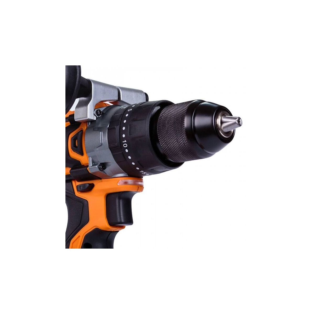 Perceuse à percussion électrique sans fil FUSE VIllager VLP5120 moteur brushless sans balai. Chargeur et batterie non inclus. 2 vitesses avec inverseur 0 à 500 et 0 à 1800 tours minute. Percussion pour matériau dur 0 à 28000 impacts minute. Force de serrage avec couple de 60Nm maxi. Poignée latérale amovible pour une meilleure prise et force. Réglage du couple 20 positions pour un travail précis. Capacité de perçage et de vissage avec mèche jusqu'à 13mm. Lumière à led pour voir sa zone de travail. Garantie 2 ans. Existe aussi en pack 'prêt à l'usage' chargeur et batterie compris. Outil à batterie à compléter avec l’un des nombreux équipements électriques sans fils de la gamme Fuse Villager. Informations SAV: Service Après Vente assuré par une Equipe interne à la société Tondeuse-et-compagnie dûment formée et agréée par le fabricant à l'intervention sur les produits de la marque. Montage: Notice de montage et d'assemblage disponible en langue française réalisée par notre équipe technique Accessoires: Batterie et chargeur en option Type de moteur: Electrique Moteur: Sans balai - Batterie Lithium ion Tension: 18 V Régime moteur: 0 à 1800 tours/min Fonction: Perceuse - Visseuse - Dévisseuse Couple: 60 Nm Diamètre de mandrin: 0,8 à 13 mm Guidon: Poignée latérale Couleur: Orange Durée de garantie: 2 ans Poids à vide (Kg): 1,42 Kg Dimension emballage: 55,5 x 22,3 x 25,2 cm
