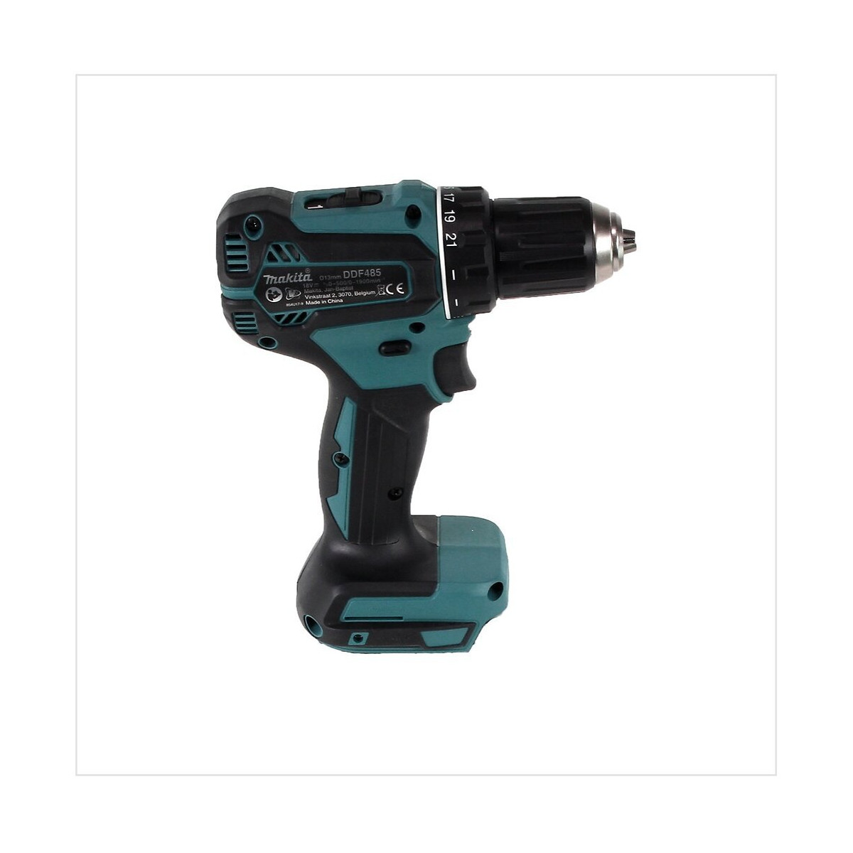 AVANTAGES PRODUIT Perceuse visseuse MAKITA DDF485Z Technologie XPT limitant les infiltrations d'eau et poussières Crochet ceinture positionnable gauche et droite Réglage précis du couple de vissage en 21 positions + position perçage L'éclairage LED incorporé permet une bonne visibilité de la base de travail 2 vitesses à engrenages métalliques : fiabilité et efficacité lors du perçage et du vissage Moteur sans charbon : usure plus lente, consommation réduite, autonomie et puissance de la machine accrues CARACTERISTIQUES TECHNIQUES Perceuse visseuse MAKITA DDF485Z Puissance Tension 18 V Batterie Composition chimique batterie Li-Ion Vitesse linéaire ou périphérique Nombre de vitesses 2 Régime Vitesse à vide V1/V2 0 à 500 / 0 à 1900 tr/min Vitesse à vide V1 0 à 500 tr/min Vitesse à vide V2 0 à 1900 tr/min Capacité de serrage Couple de serrage max. (élast/franc) 27 / 50 Nm Couple de serrage max. (élast.) 27 Nm Couple de serrage max. (franc) 50 Nm Capacité maximale : vis à bois 6 x 75 mm Capacité : vis de mécanique M6 Capacité de perçage / burinage Ø max. dans l'acier 13 mm Ø max. dans le bois 38 mm Ø max. dans acier/bois 13 / 38 mm Outillage à utiliser Capacité maximale du mandrin 13 mm Niveaux d'exposition et de vibrations Vibration 3ax perçage (ah) 2,5 m/s² Pression sonore (Lpa) 74 dB (A) Général Dimensions (L x l x h) 169 x 79 x 255 mm Poids net EPTA 1,4 kg OUTIL VENDU SANS BATTERIES NI CHARGEUR