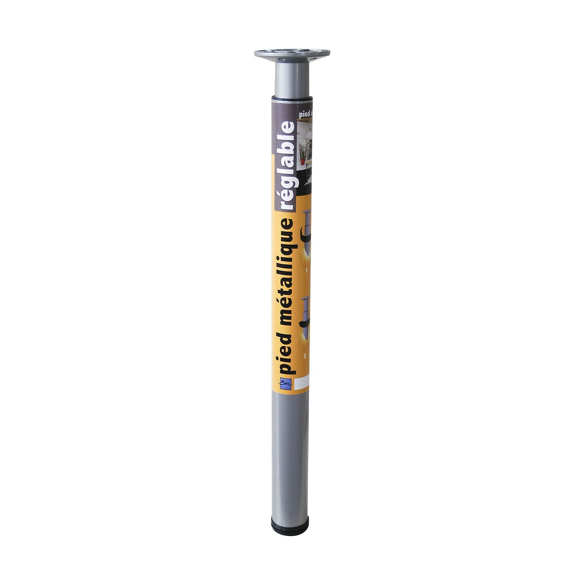 Pied aluminium réglable cylindrique diamètre 6cm hauteur 70-110cm - Charge : 80kg par pied - Platine diamètre 11cm - Finition : époxy gris - Patin + Vérin réglable.Spécifications techniques
