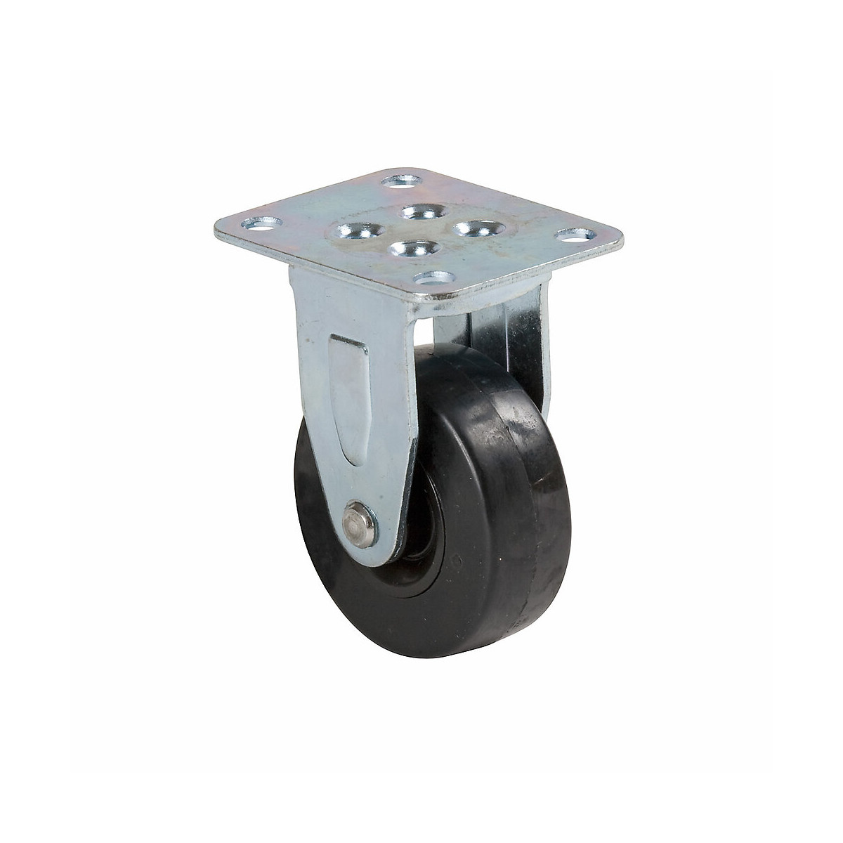 Roulette fixe 56 mm haut. 42 mm diamètre en caoutchouc gris et fixation par platine pivotante, charge 25kg. Roulette pour appareils légers.Spécifications techniques