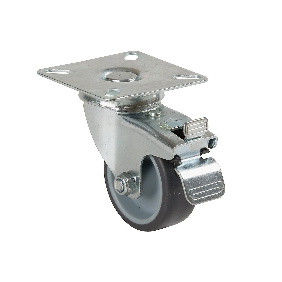 Roulette pivotante à platine et frein 58 mm largeur 58 mm longueur 86 mm haut. 65 mm diamètre avec bandage caoutchouc gris, 35kg charge.Spécifications techniques
