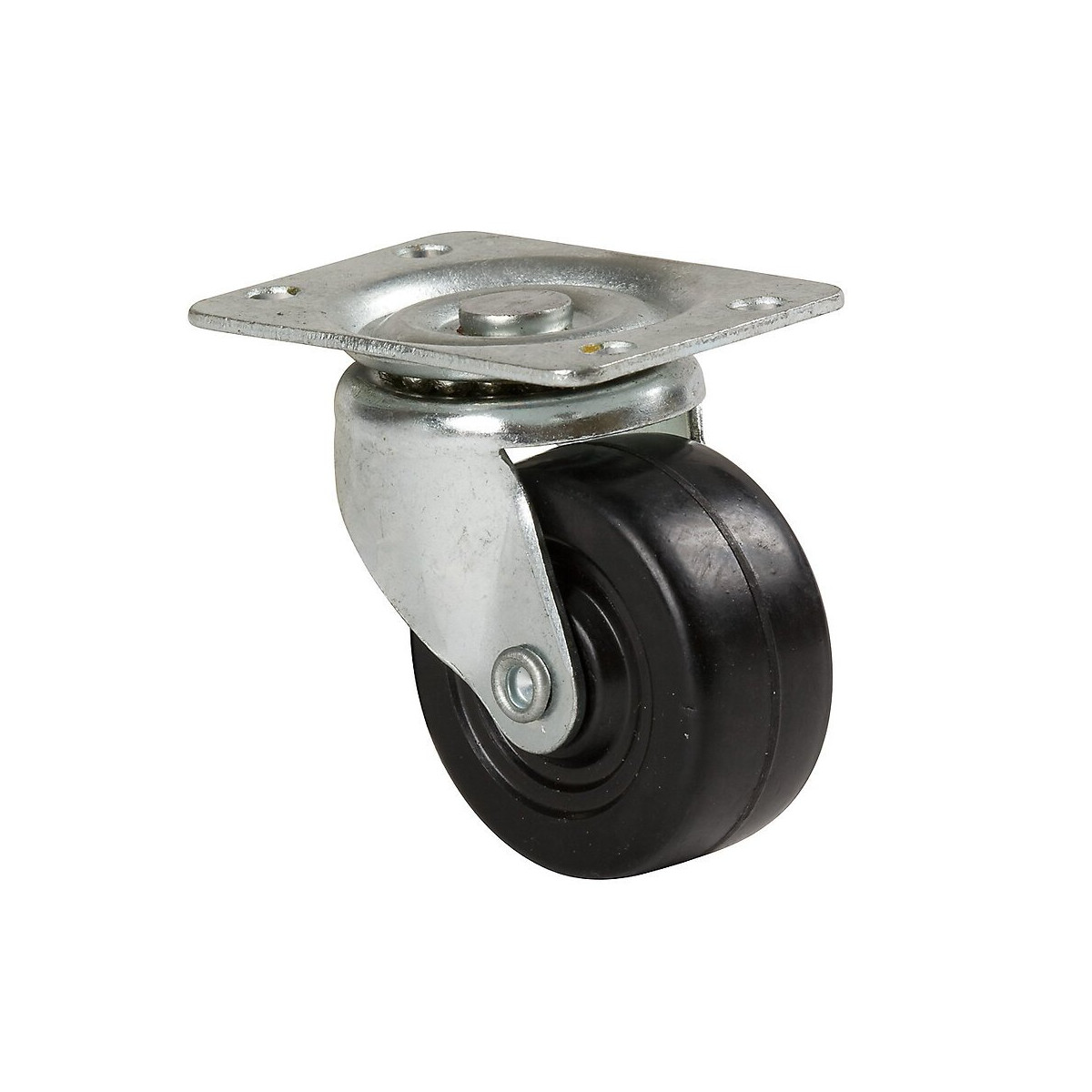 Roulette pivotante 50 mm diamètre 67 mm haut. avec bandage caoutchouc noir et fixation par platine pivotante pour sol irrégulier, 30kg charge.Spécifications techniques