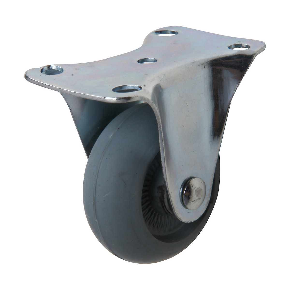 Roulette fixe. Bandage caoutchouc gris. Platine 46x31 mm. Hauteur 46 mm. Diamètre 35 mm. Charge utile 20kg.Spécifications techniques