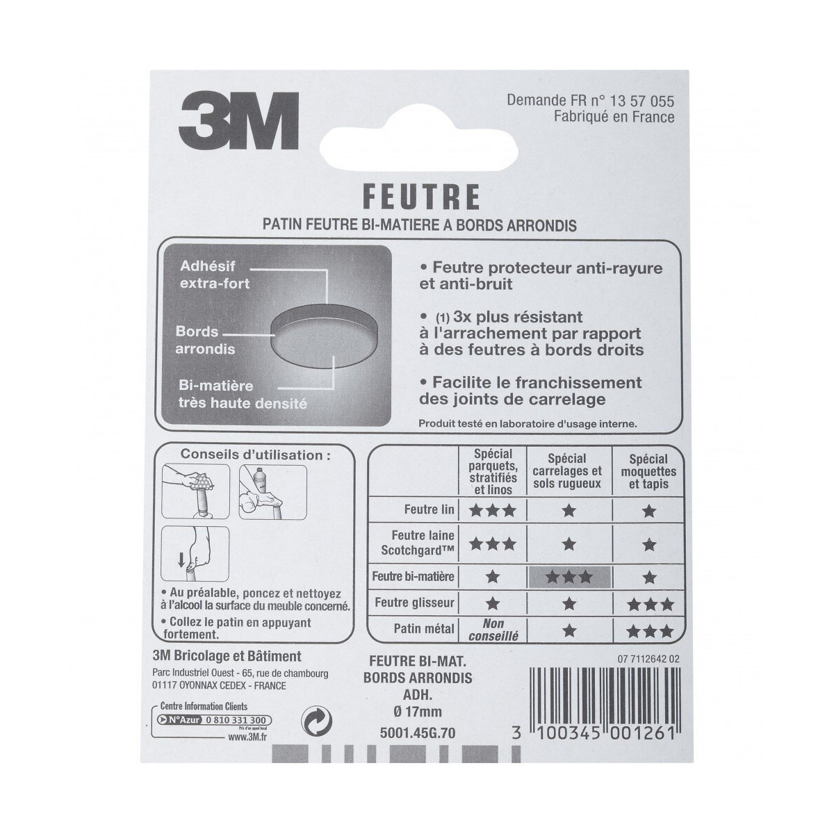Spécial carrelage et sol rugueux Patins disposant de bords arrondis: 3 fois plus résistants lors des franchissements des joints de carrelage, par rapport à des feutres à bords droits. Conçus en bi-matière très haute densité avec adhésif extra fort. Permettent de réduire le bruit de 30 décibels maximum Fixation: Adhésif Usage (patin, feutre, emboût): Protecteur(s) Sols adaptés: Carrelage, béton Type de sol: Carrelage Forme: Rond Diamètre (en mm): 17 Epaisseur (en mm): 6 Matière principale: Feutre Densité de la laine (en kg/m³): 200 Produit emballé : hauteur (en cm): 11.9 Produit emballé : largeur (en cm): 9.3 Produit emballé : profondeur (en cm): 0.9 Produit emballé : poids (en kg): 0.014
