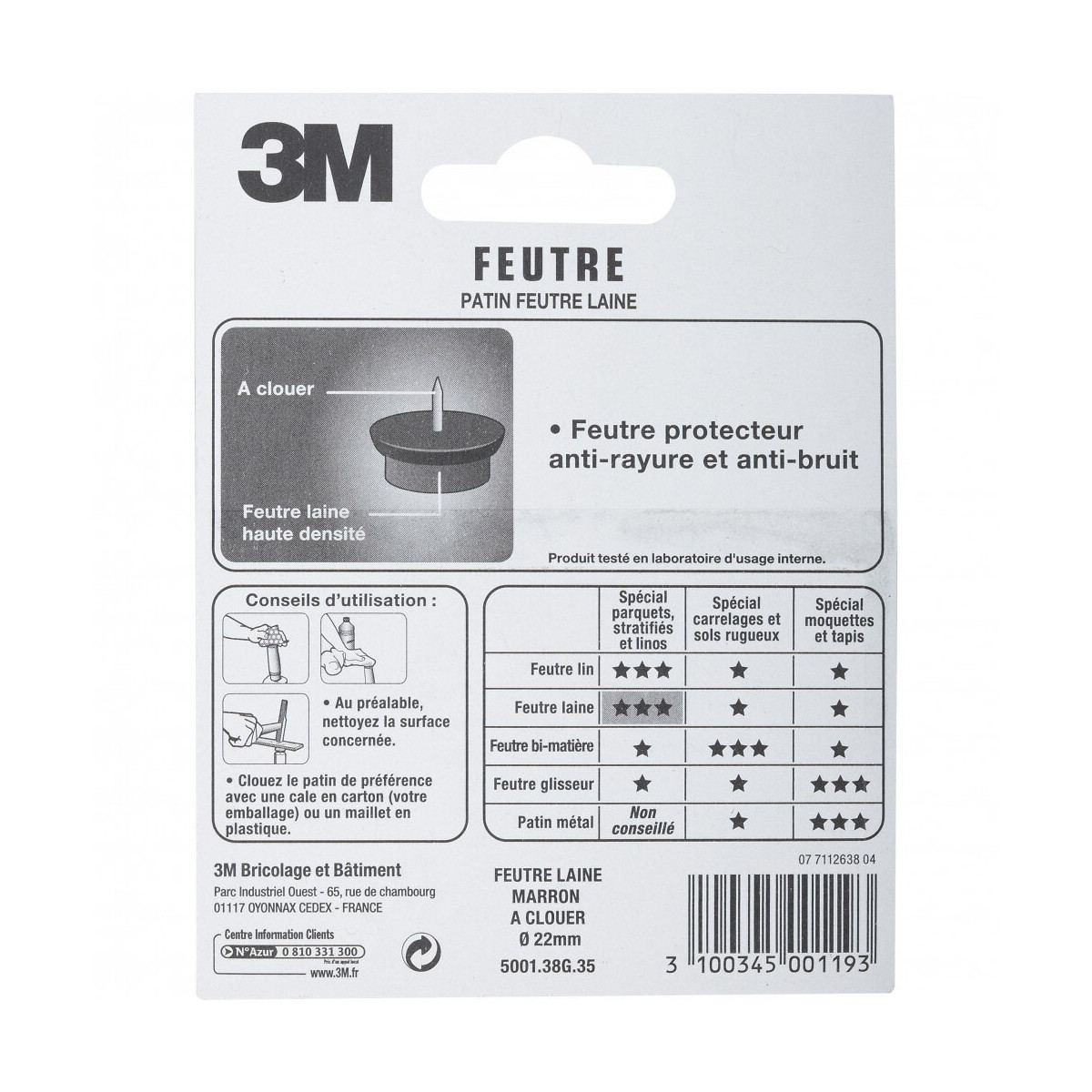 Spécial bois. Laine naturelle, protection haute densité. Réduction du bruit Patins disposant d'une protection en laine haute densité. Permettent de réduire le bruit de 30 décibels maximum. Fixation: A clouer Usage (patin, feutre, emboût): Protecteur(s) Sols adaptés: Parquets, stratifiés, linoleum Type de sol: Parquet Forme: Rond Diamètre (en mm): 22 Matière principale: Feutre Densité de la laine (en kg/m³): 175 Produit emballé : hauteur (en cm): 11.9 Produit emballé : largeur (en cm): 9.3 Produit emballé : profondeur (en cm): 2.8 Produit emballé : poids (en kg): 0.018