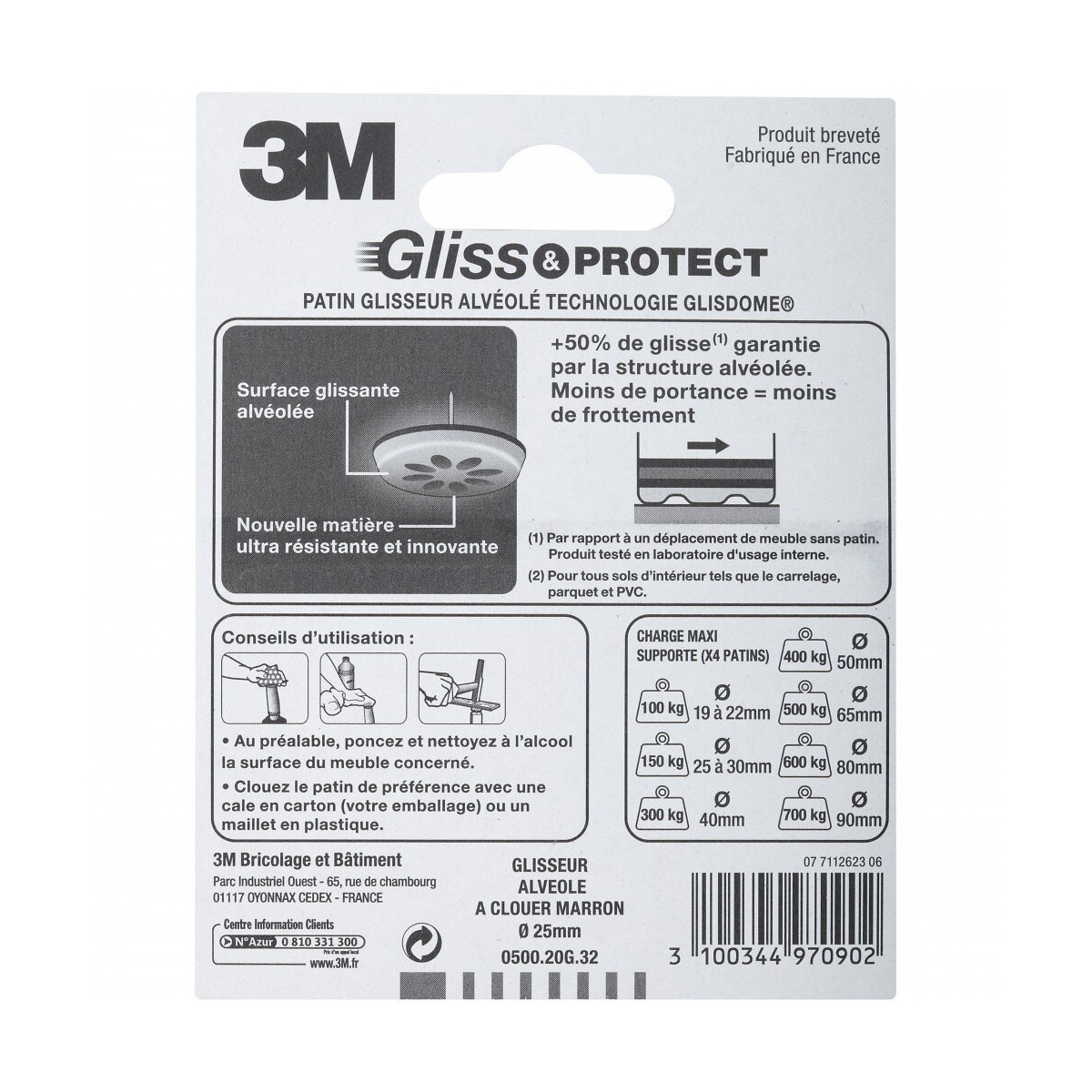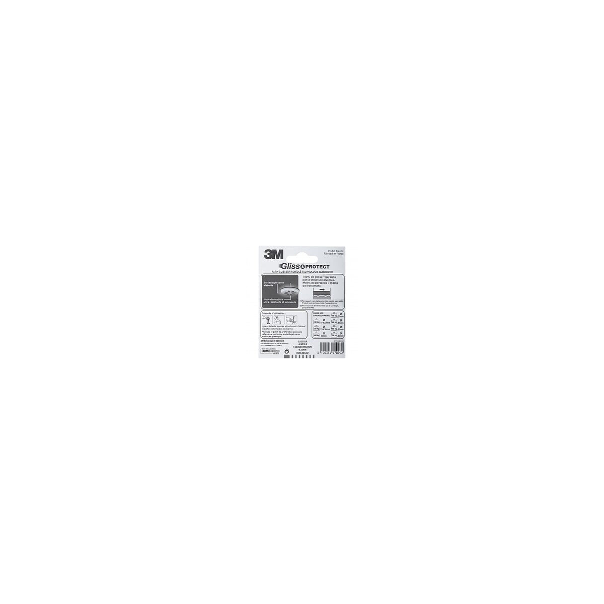 Technologie Glisdome. Patins dotés de la technologie Glisdome : la structure alvéolée garantit +50% de glisse (par rapport à un meuble non équipé en patin) offrant ainsi moins de portance et moins de frottement. Le mécanisme de la rotule articulée et mousse compensatrice facilite le franchissement des irrégularités du sol. Adhésif extra fort. Permettent de réduire le bruit. Charge max. supportée : 150Kg. Fixation: A clouer Usage (patin, feutre, emboût): Glisseur(s) Sols adaptés: Tous types de sol Type de sol: Tous types de sol Forme: Rond Diamètre (en mm): 25 Matière principale: Plastique Produit emballé : hauteur (en cm): 11.8 Produit emballé : largeur (en cm): 9.3 Produit emballé : profondeur (en cm): 2.6 Produit emballé : poids (en kg): 0.018