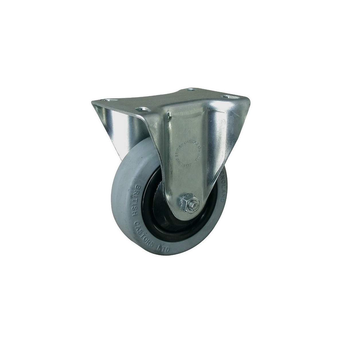 Roulette fixe sans frein (platine 105 x 85 mm). Diamètre / Charge : 100 mm / 85 kg. Bandage en caoutchouc sur jante en nylon.