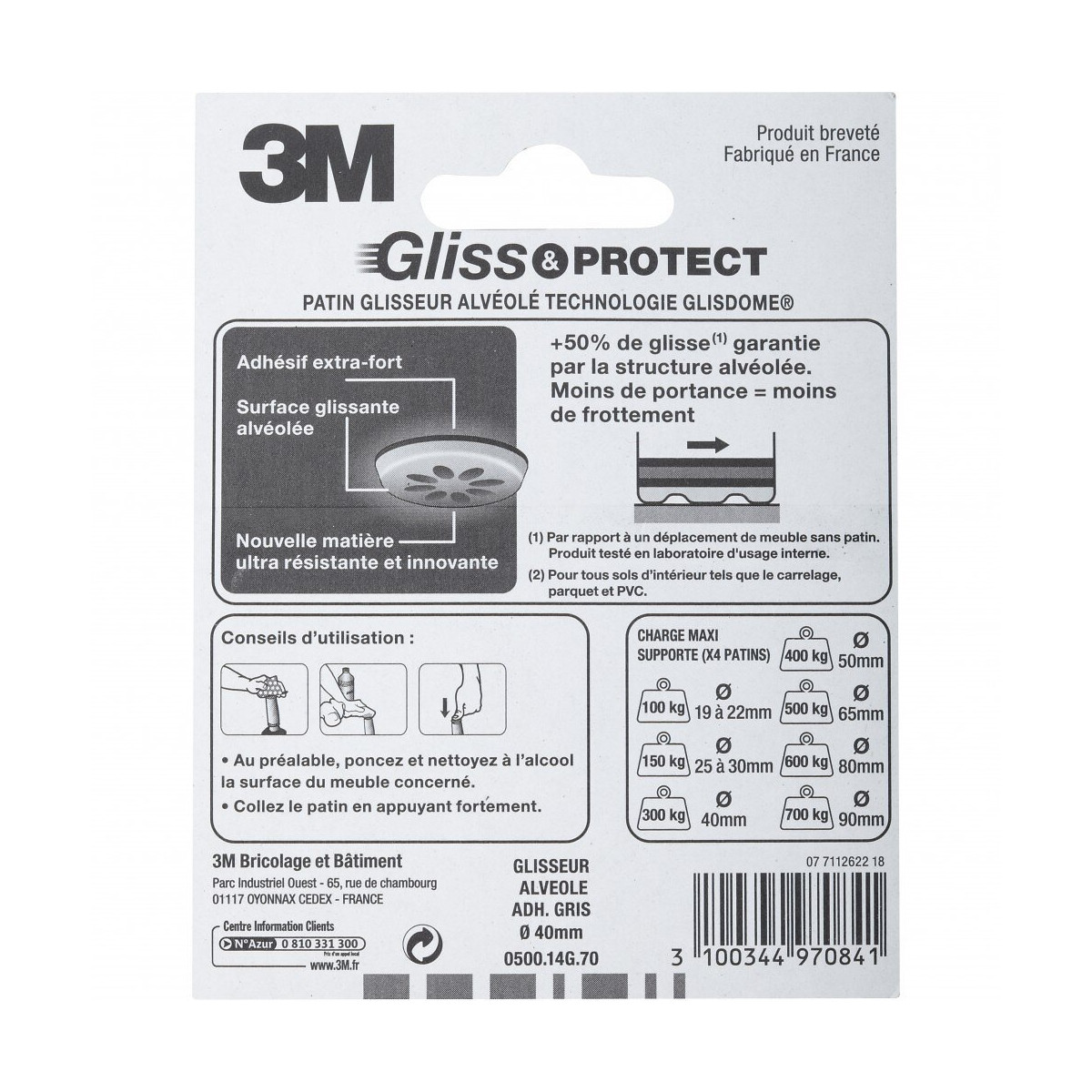 Technologie Glisdome. Patins dotés de la technologie Glisdome : la structure alvéolée garantit +50% de glisse (par rapport à un meuble non équipé en patin) offrant ainsi moins de portance et moins de frottement. Le mécanisme de la rotule articulée et mousse compensatrice facilite le franchissement des irrégularités du sol. Adhésif extra fort. Permettent de réduire le bruit. Charge max. supportée : 300Kg. Fixation: Adhésif Usage (patin, feutre, emboût): Glisseur(s) Sols adaptés: Tous types de sol Type de sol: Tous types de sol Forme: Rond Diamètre (en mm): 40 Epaisseur (en mm): 5 Matière principale: Plastique Produit emballé : hauteur (en cm): 11.9 Produit emballé : largeur (en cm): 9.3 Produit emballé : profondeur (en cm): 1.7 Produit emballé : poids (en kg): 0.02Spécifications techniques