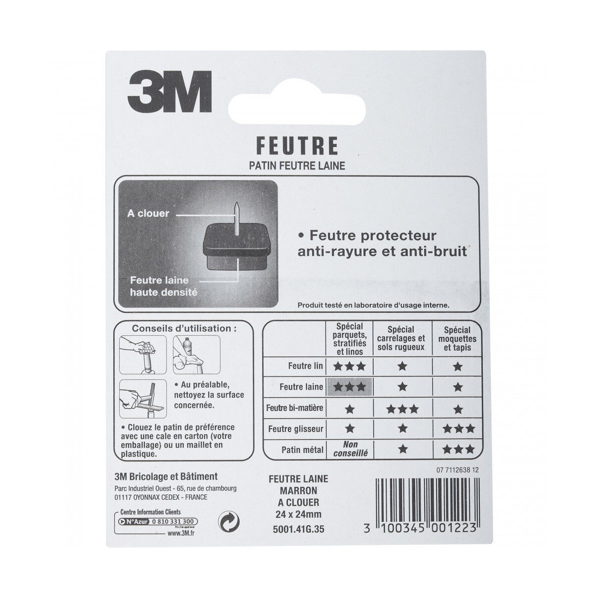 Spécial parquets, stratifiés et linos Patins disposant d'une protection en laine haute densité. Permettent de réduire le bruit de 30 décibels maximum. Fixation: A clouer Usage (patin, feutre, emboût): Protecteur(s) Sols adaptés: Parquets, stratifiés, linoleum Type de sol: Parquet Forme: Carré Largeur (en mm): 24 Longueur (en mm): 24 Matière principale: Feutre Densité de la laine (en kg/m³): 175 Produit emballé : hauteur (en cm): 12 Produit emballé : largeur (en cm): 9.3 Produit emballé : profondeur (en cm): 2.7 Produit emballé : poids (en kg): 0.022Spécifications techniques