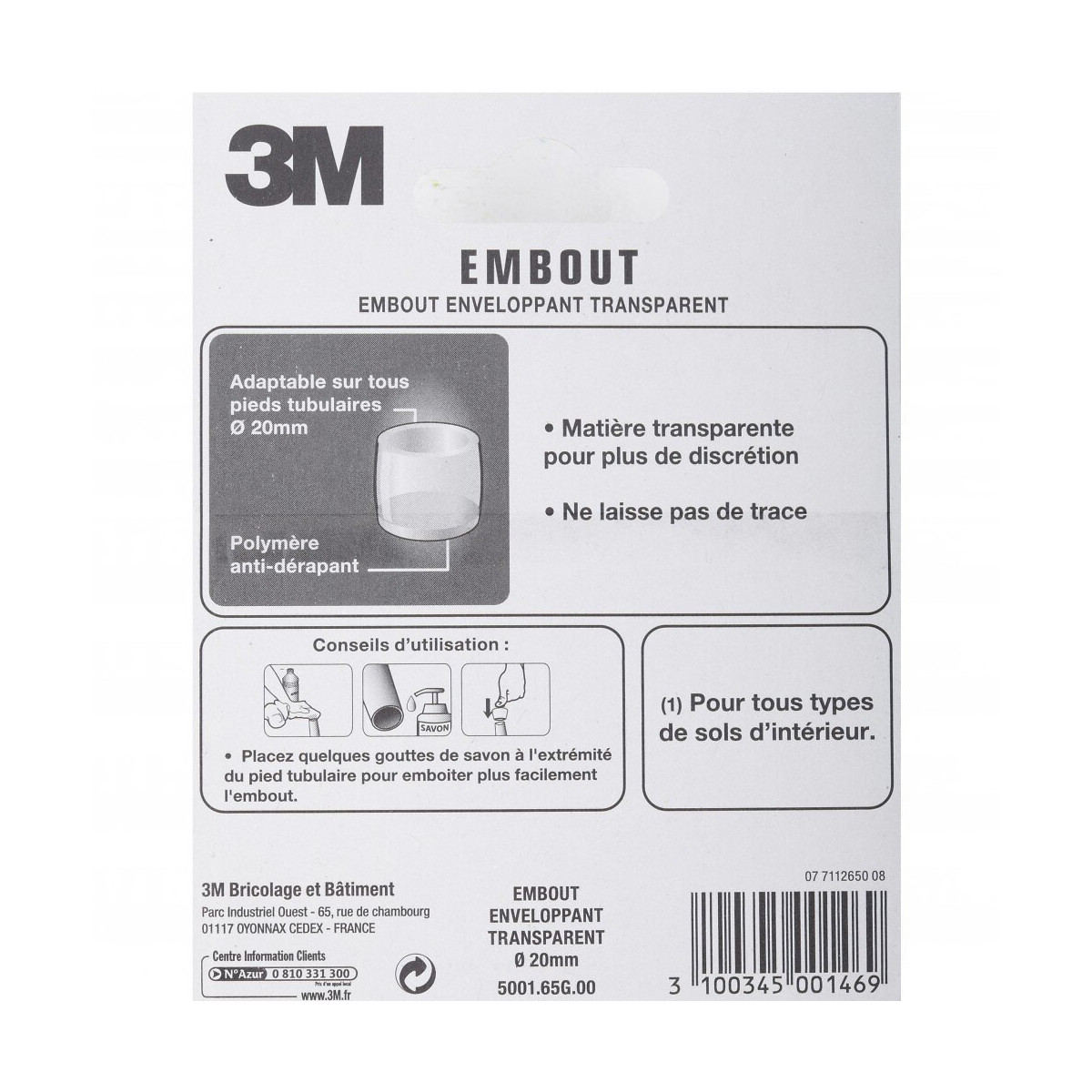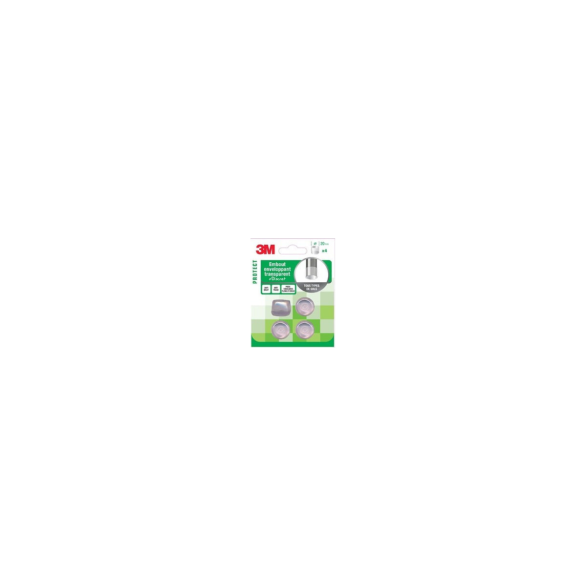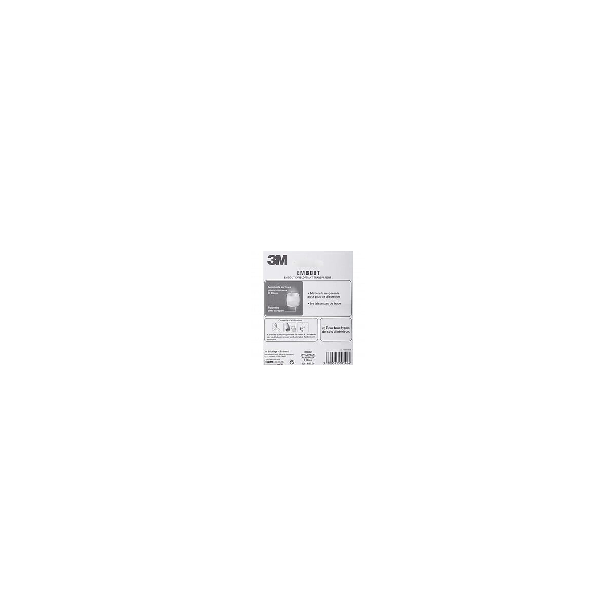 Pieds tubulaires pleins et creux. Discret (transparent), anti-bruit, anti-rayures et anti-traces Embouts enveloppants discrets (transparents). Anti-bruit, anti-rayures et anti-traces. Fixation: A emboîter Forme: Rond Usage (patin, feutre, emboût): Antibruit Hauteur (en mm): 18 Diamètre (en mm): 20 Matière principale: Plastique Sols adaptés: Tous types de sol Fabrication "Union Européenne": Non Fabrication française: Non Produit emballé : hauteur (en cm): 11.9 Produit emballé : largeur (en cm): 9.3 Produit emballé : profondeur (en cm): 3.2 Produit emballé : poids (en kg): 0.032 Indication du geste de tri (triman): Nos produits et emballages peuvent faire l'objet d'une consigne de tri. Pour en savoir plus : www.quefairedemesdechets.frSpécifications techniques