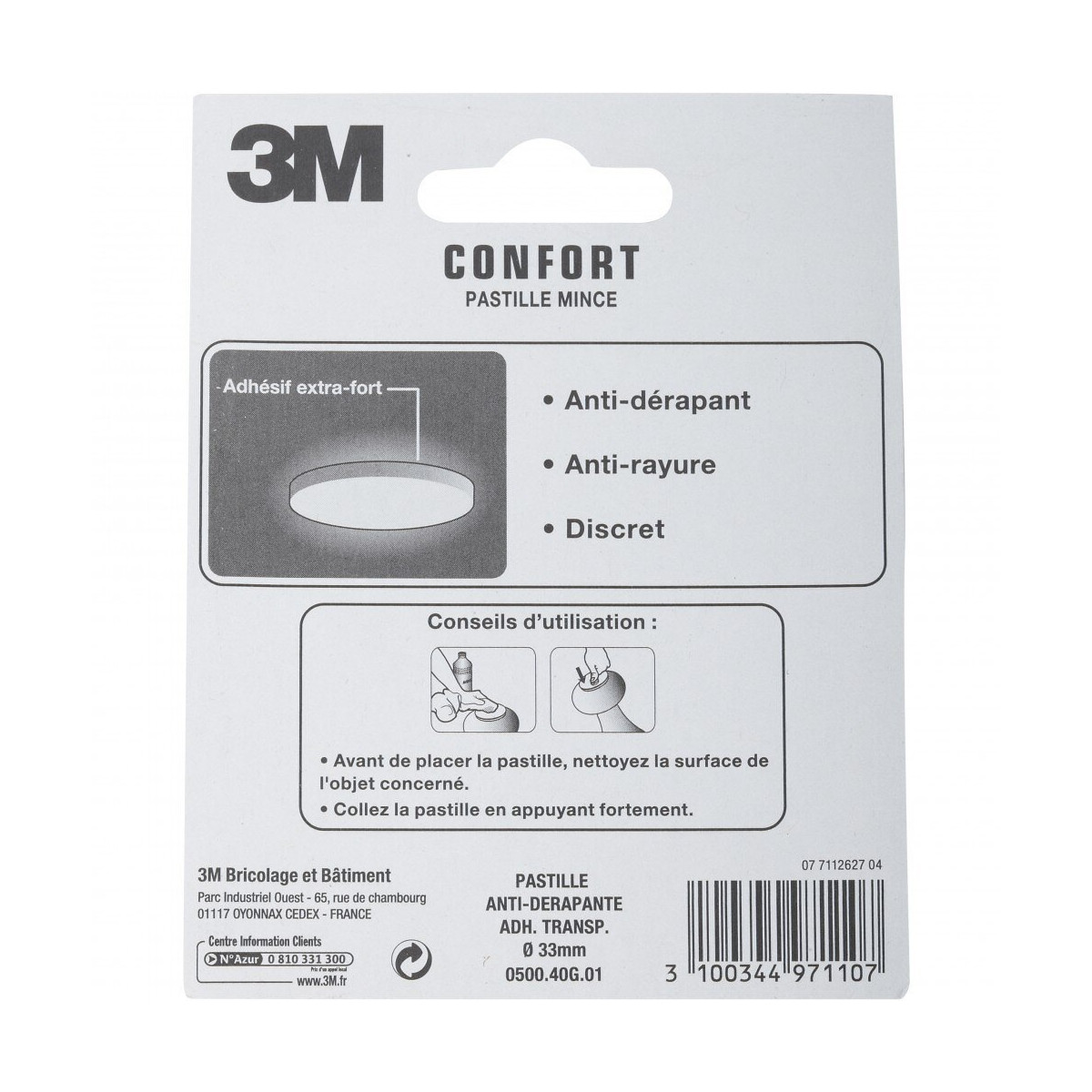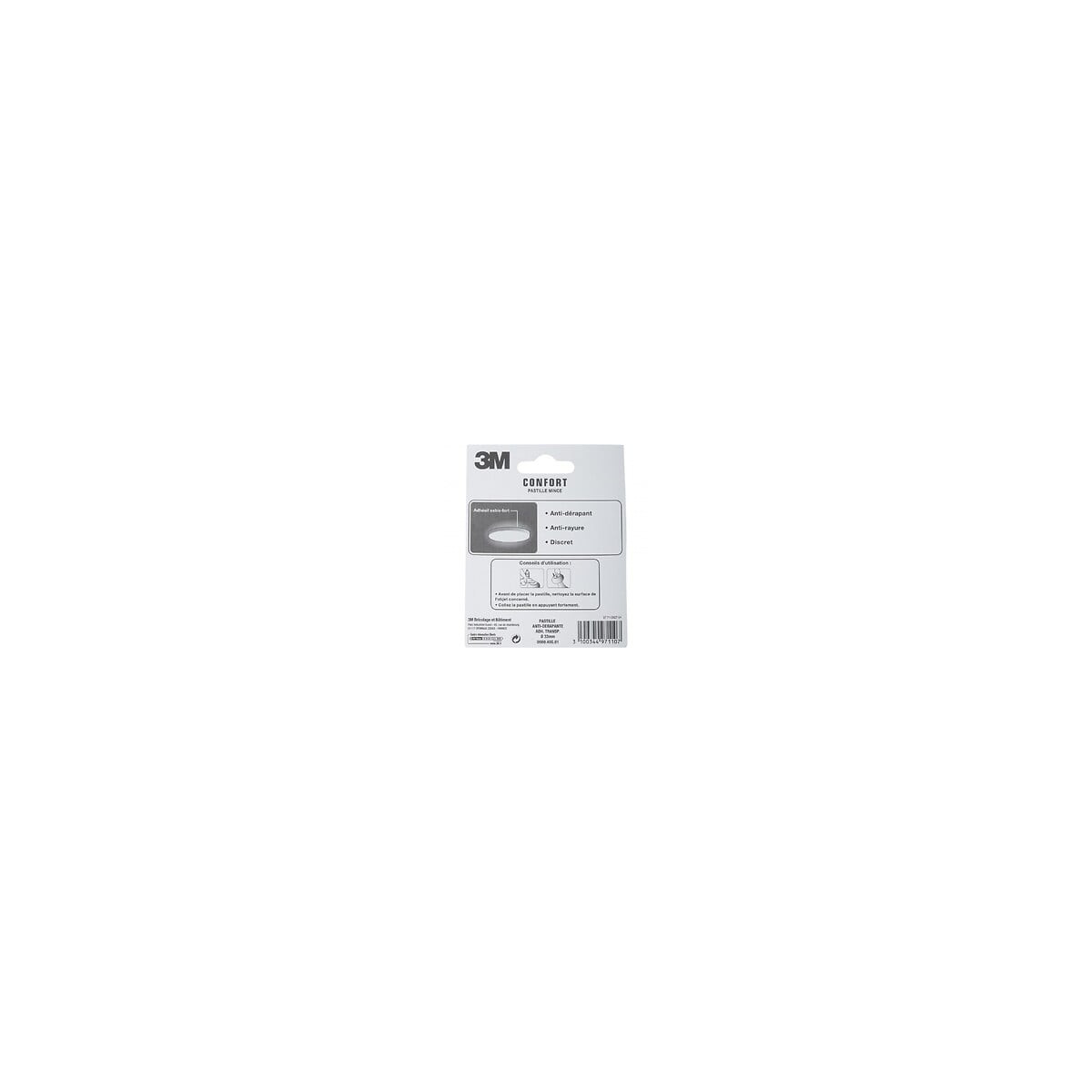 Spécial objets, bibelots Pastilles discrètes antidérapantes et anti-rayures. Adhésif extra fort. Fixation: Adhésif Usage (patin, feutre, emboût): Antirayure Forme: Rond Diamètre (en mm): 33 Epaisseur (en mm): 1 Matière principale: Plastique Produit emballé : hauteur (en cm): 11.9 Produit emballé : largeur (en cm): 9.3 Produit emballé : profondeur (en cm): 0.7 Produit emballé : poids (en kg): 0.026Spécifications techniques