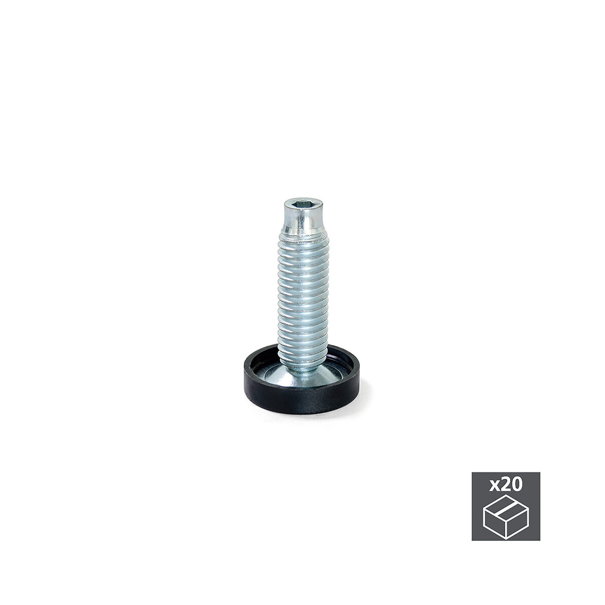 Vérin pour meubles à réglage extérieur ou intérieur grâce à sa tête allen 4 hexagonale. Pour le réglage depuis l'intérieur du meuble il faudra effectuer un perçage traversant. Il dispose d’une vis M10 et d’un cache circulaire D. 23 mm en plastique noir. Le montage requiert d’un écrou M10.