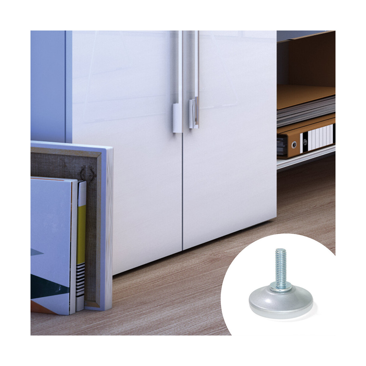 Vérin avec écrou à réglage externe pour tous type de meubles. Il dispose d’une vis M6 et d’une base circulaire de diamètre 35 mm en plastique couleur aluminium peint. Le montage requiert d’un écrou M6.