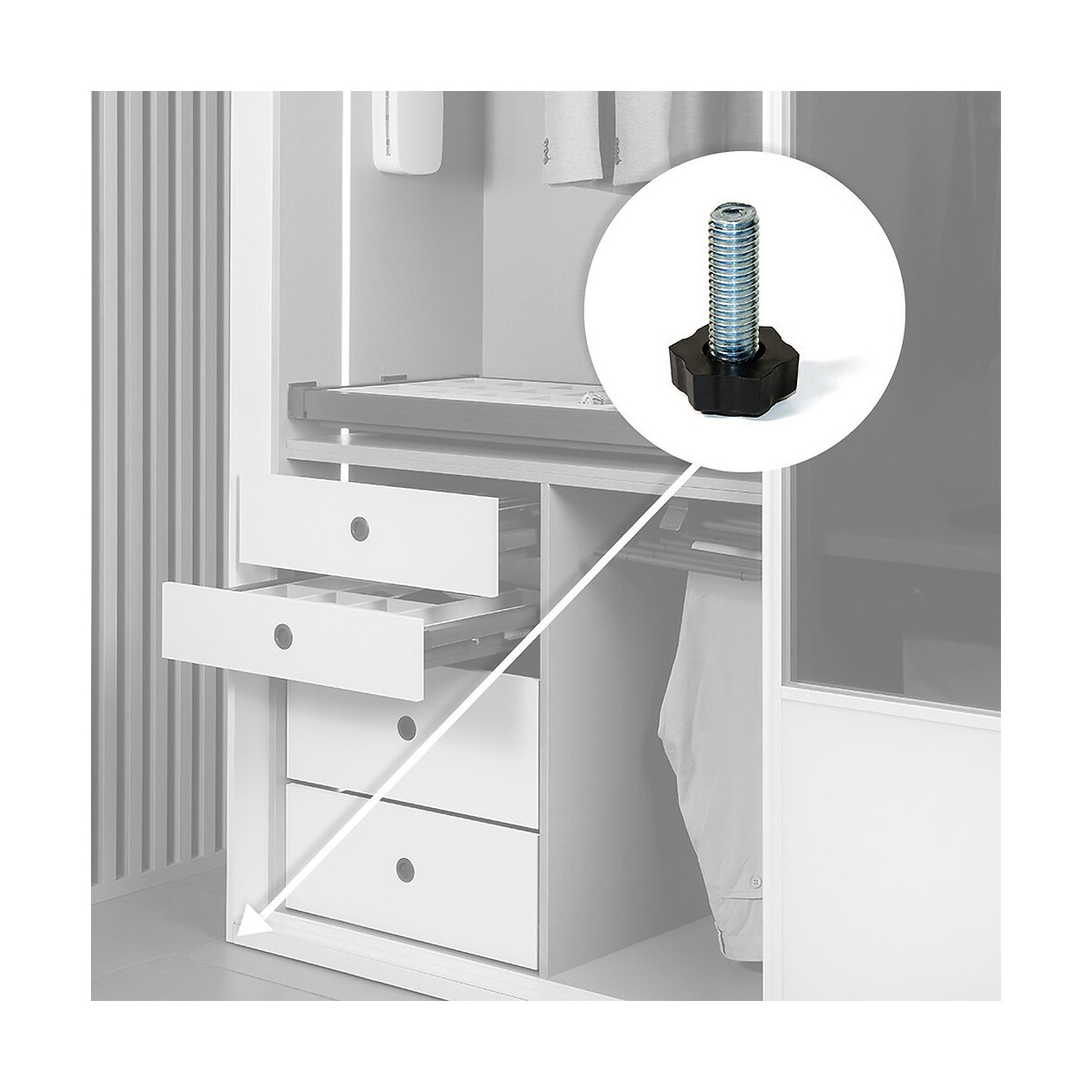 Vérin à réglage extérieur pour ajuster la hauteur de tous types de meubles. Il dispose d’une vis M8 et d’une base hexagonale en plastique noir. Le montage requiert d’un écrou M8.