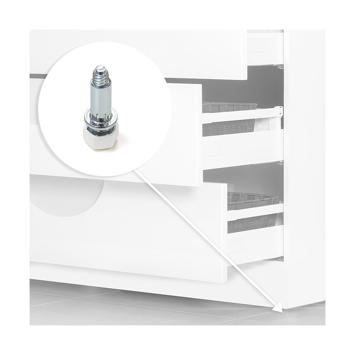 Vérin avec écrou à réglage externe pour tous types de meubles. Il dispose d’une vis M6, avec un écrou de réglage et un cache hexagonale en plastique blanc.