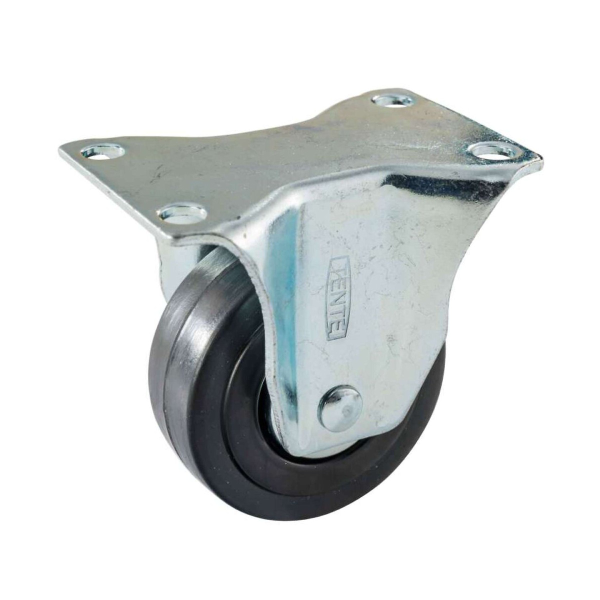 Roulette fixe, Chape en acier inoxydable. Chape en acier zingué, pivot sur simple rangée de billes. Axe de roue boulonné. Fixation à platine. Corps de roue en polypropylène. Bandage en caoutchouc semi élastique noir. Moyeu lisse, pare fils