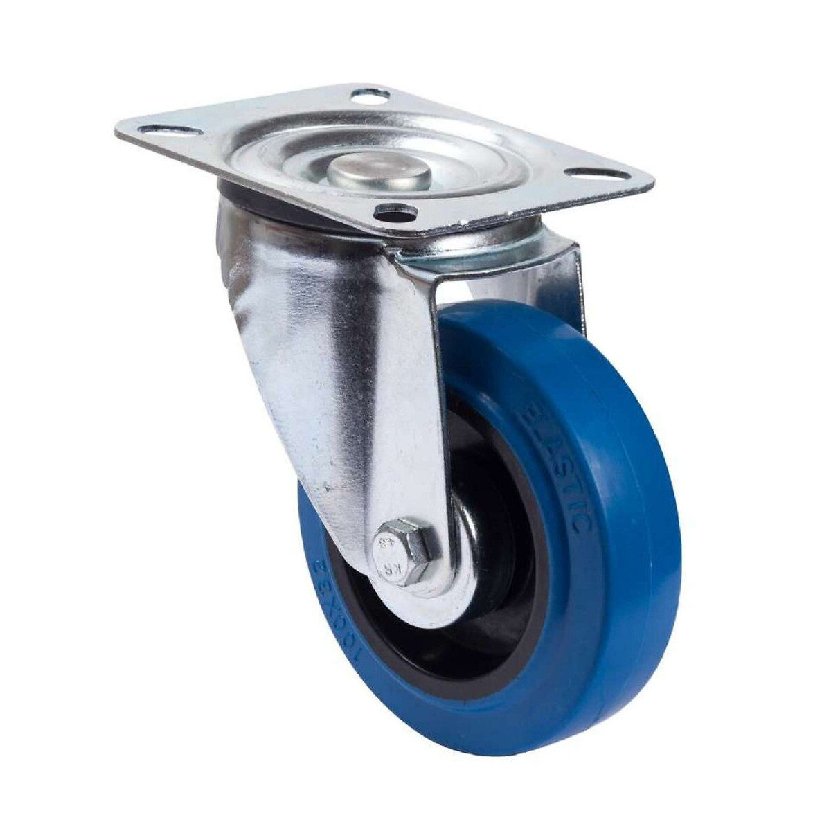 Informations techniques: Roulette pivotante pour un usage pro Charge maxi: 150 kg Diamètre de la roue: 125 mm Bandage caoutchouc élastique bleu Chape en acier zingué Platine de fixation 105 x 85 mm 4 trous de diamètre 9 mm Entre-axe 80 x 60 mm Hauteur totale: 156 mm
