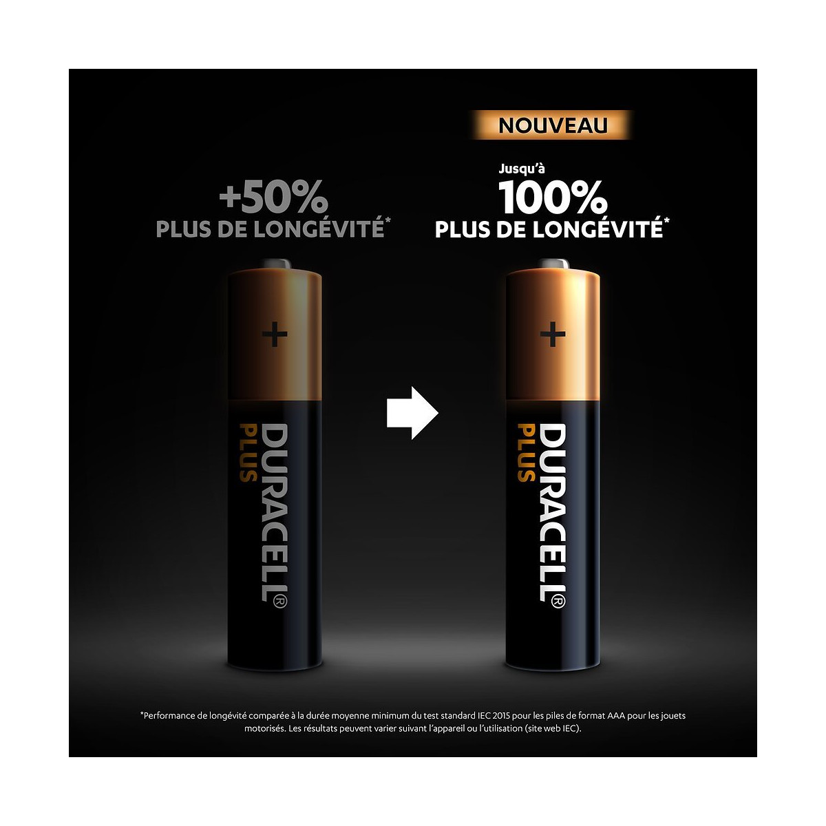 Duracell vous propose une large vaste gamme de piles pour les appareils électroniques qui nécessitent une alimentation fiable. Les piles AAA Duracell Plus sont des piles alcalines idéales pour alimenter tous vos appareils. La pile AAA Duracell Plus offre jusqu'à 100 % de durée de vie supplémentaire* (*performance de longévité comparée à la durée moyenne minimum du test standard IEC 2015 pour les piles de format AAA pour les jouets motorisés. Les résultats peuvent varier suivant l'appareil ou l'utilisation (site web IEC). Les piles Duracell inutilisées peuvent conserver toute leur énergie pendant jusqu'à 10 ans dans leur emballage et dans des conditions normales de stockage. Duracell recommande ces piles pour les appareils utilisés de façon régulière, tels que les jouets motorisés, les lampes de poche, les appareils audio numériques, etc. Duracell fut même la première pile à être allée sur la lune en participant à la mission Apollo 11 en 1969.Spécifications techniques