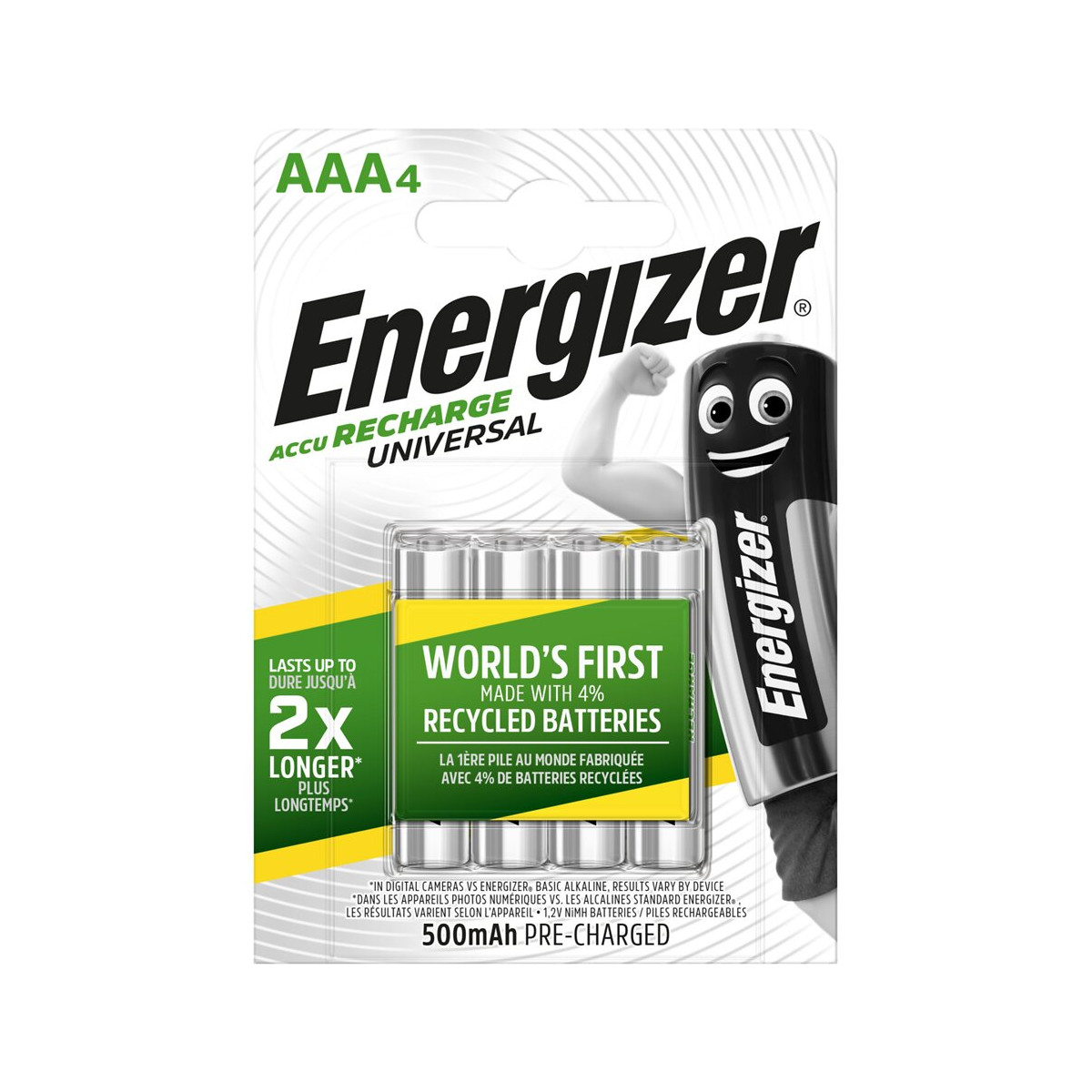 Piles Rechargeables ENERGIZER Universal AAA/LR3 500mAh, pack de 4. Les piles rechargeables ENERGIZER Recharge Universal sont préchargées et prêtes à l'emploi. Rechargeables jusqu'à 1000 fois. Énergie conservée jusqu'à 1 an (si conservées dans leur emballage).Spécifications techniques