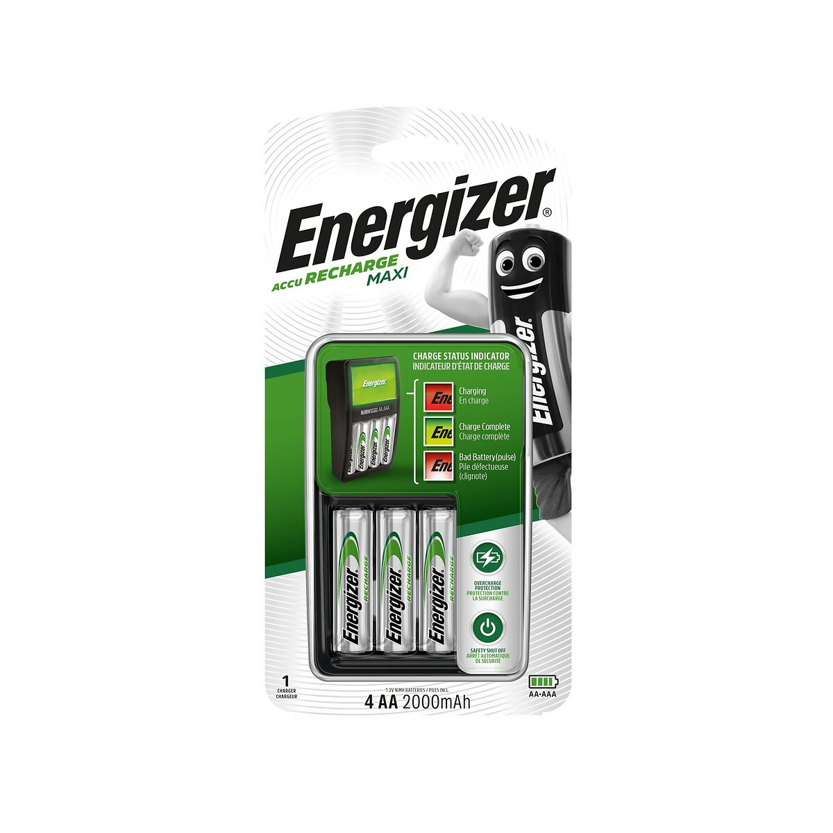 Chargeur Maxi ENERGIZER + 4 piles AA/LR6 incluses. Une source d'énergie à portée de main avec le chargeur pratique ENERGIZER Recharge Maxi. Très commode, il charge 2 ou 4 piles NiMH AA ou AAA en 5 heures.* *La durée peut varier selon la pile NiMH.Spécifications techniques