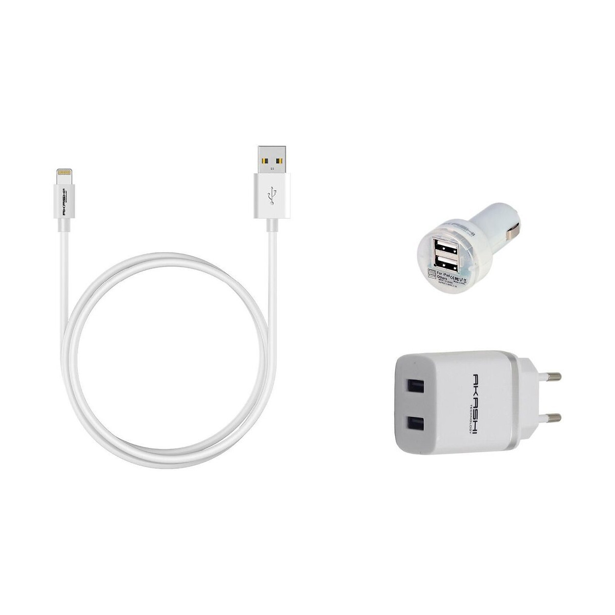 GENERAL Type Kit chargeurs Marque Agréée Universelle Divers Chargeur secteur double USB + allume-cigare double USB + Câble Lightning (vendu en vrac) Couleur Blanc CONNECTIQUE Prise USB 2 x 2 A + 2 x 2 A ACCESSOIRES Contenu du pack Chargeur 2 USB + chargeur allume-cigare 2 USB + câble Lightning (pour iPhone 5/5S/5C/iPad 4/iPad Mini/iPad Air)Spécifications techniques