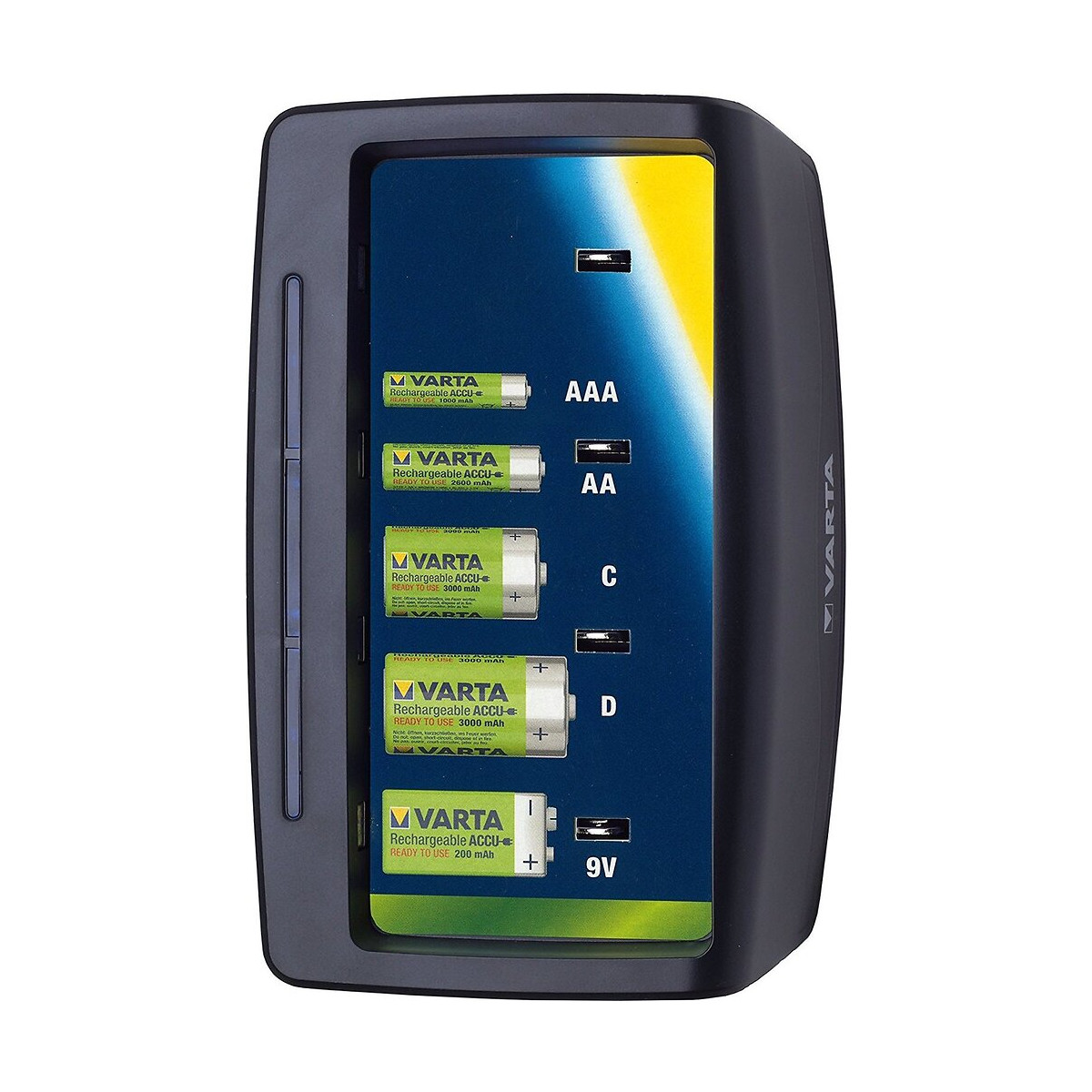 57648101401 - Chargeur de bureau universel Varta 57648101401 pour tous les formats. Forme élégante et compacte. Indication du statut de charge par LED bleue. Minuterie ? protection contre la surcharge.Temps de charge5h Temps de charge.Minuteur de coupureUne minuterie éteint après une durée spécifiée, indépendamment de l'état de charge.Voltage mondialTension globale pour une utilisation dans le monde entier. - Charge 2 / 4 piles AA/AAA/C/D ou 1 pile 9 V. Retrait des piles facilité. Usage mondial (100 - 240 V). Temps de charge : 5 h (basé sur 2AA 1600 mAh). Format de piles : AAA, AA, C, D, 9V. Technologie : Nickel Hydride (NiMH). Courant de charge: AAA : 150 (± 10%) mA. AA : 380 (± 10%) mA. C : 380 (± 10%) mA. D : 380 (± 10%) mA. 9V : 34 (± 10%) mA. Charge de maintenance-Minuterie: 8h. Largeur : 180 mm. Hauteur : 240 mm. Profondeur : 85 mm. Poids : 429 g.