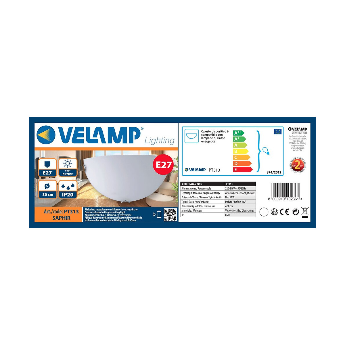 SAPHIR: Plafonnier demi-lune en verre poli blanc. Un design classique et intemporel qui convient à toutes les maisons. Diffuseur en verre, diamètre 30 cm. Fonctionne avec une ampoule E27 non incluse. L'ampoule peut être LED, à incandescence ou à économie d'énergie. Ne doit pas dépasser 40 W de consommation. Base et crochets métalliques. Le produit est fini avec soin. Velamp est une marque italienne : nos produits sont soignés, selon la norme et la qualité.