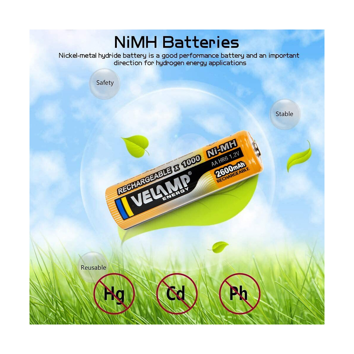 Batteries rechargeables Velamp: 2 batteries rechargeables AA Ni-MH 2600mAh 1,2 V. Autodécharge réduite: les batteries rechargeables peuvent être rechargées plus de 1000 fois. Elles ont une faible autodécharge. Elles conservent toujours 80% de leur capacité après 3 ans de non utilisation (il est fortement recommandé de recharger complètement tous les 3 mois) . Compatible avec de nombreuses applications: les batteries rechargeables Velamp Ni-MH fonctionnent avec: appareils photo, souris pc, télécommandes, jouets jeux électroniques, portables, radio, lampes de poche, rasoirs électriques, réveil, téléphone sans fil, brosses à dents, rasoirs et plus. Sécurité: pour des raisons de sécurité, les batteries ne sont pas complètement chargées à l'arrivée, veuillez les charger à 100% la première fois que vous les utilisez. Après 3 à 5 fois de charge complète, les batteries fonctionnent mieux.
