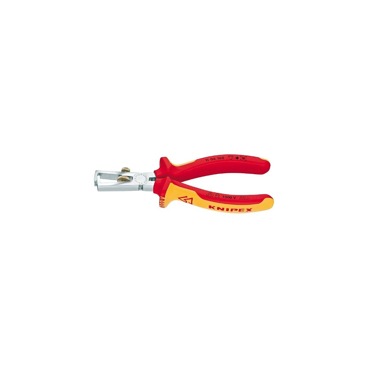 Pour conducteurs unifilaires, multifilaires et fils fins, isolation plastique ou caoutchouc diam. max. 5,0 mm et section 10,0 mm². Réglage simple du diamètre du câble ou du fil grâce à l’écrou moleté et au contre-écrou. Acier à outils spécial, forgé, trempé à l’huile. Manches bi-matière ergonomiques certifiés VDE. Longueur : 160 mm Diamètre dénudage max : 5mm Poids : 216 g