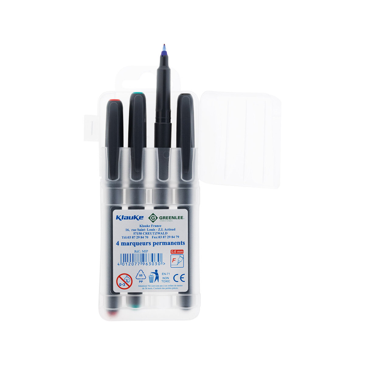 Lot de 4 marqueurs de câble indélébiles 0.6mm - Klauke Klauke jouit d'une renommée mondiale en matière de technique de connexion électrique et d'outils de pressage, de coupe et de perforation de haute qualité. En proposant des solutions spéciales pour les domaines de la technique de connexion et des outils, la marque aux besoins des secteurs les plus variés. Ce lot de 4 marqueurs indélébiles avec une pointe de 0.6mm permet de marquer les câbles de manière indélébile. Leur encre permanente est résistante à l'eau et effaçable à l'alcool. Utilisable sur verre, plastiques, films, etc. Couleurs disponibles : bleu, noir, rouge et vert. Caractéristiques: Pointe de 0.6mm Effaçable à l'alcool Couleurs disponibles : bleu, noir, rouge et vert