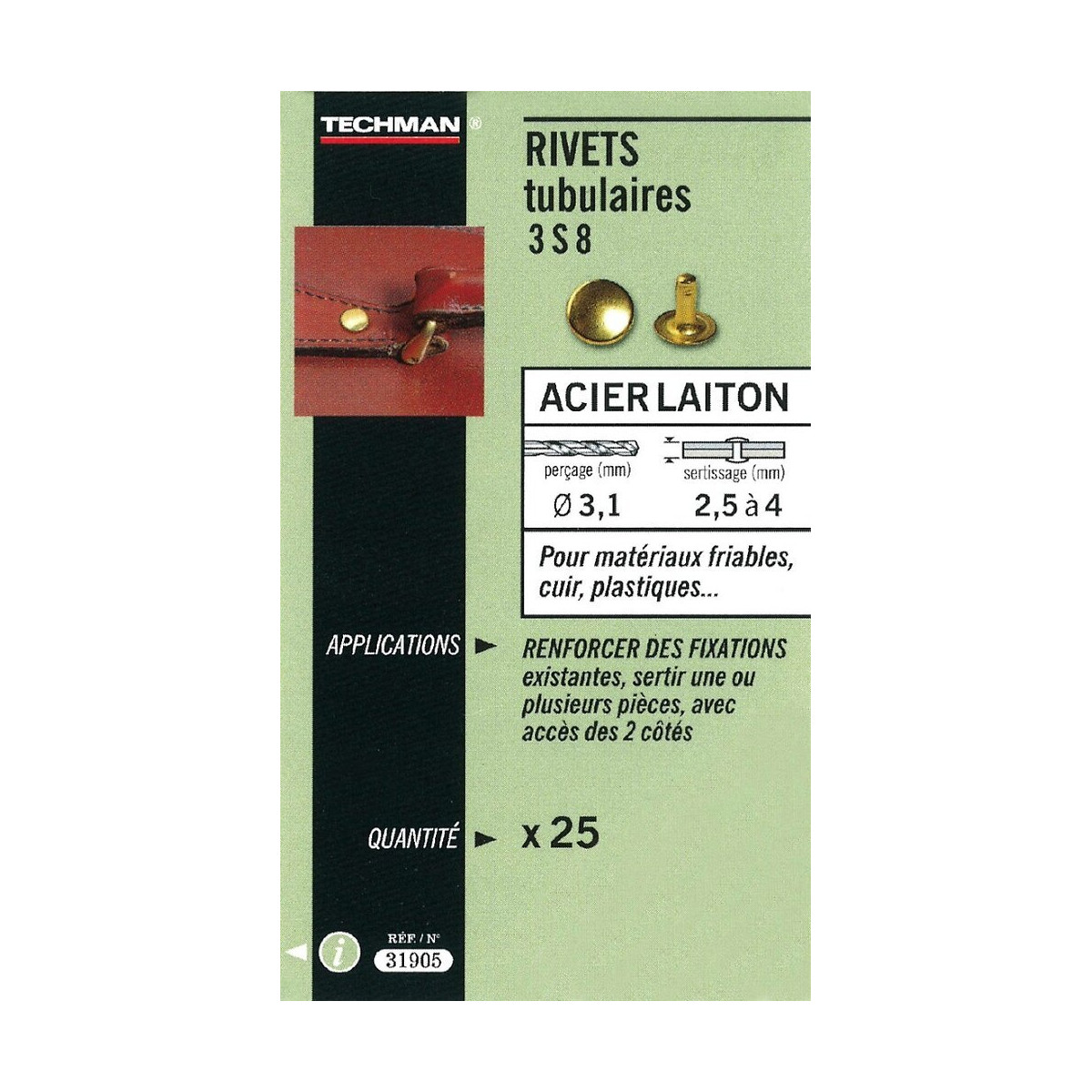 25 rivets tubulaires acier / laiton. Diamètre x longueur : 3 x 8 mm, diamètre perçage : 3,1 mm, épaisseur à sertir : 1 à 4 mm. Matériaux : matériaux friables, cuirs, plastiques, ... Applications : pour fixation avec accès des deux côtés. Renforcement de fixations existantes. Par exemple : électricité, électronique, renforts de coutures sur cuir, …