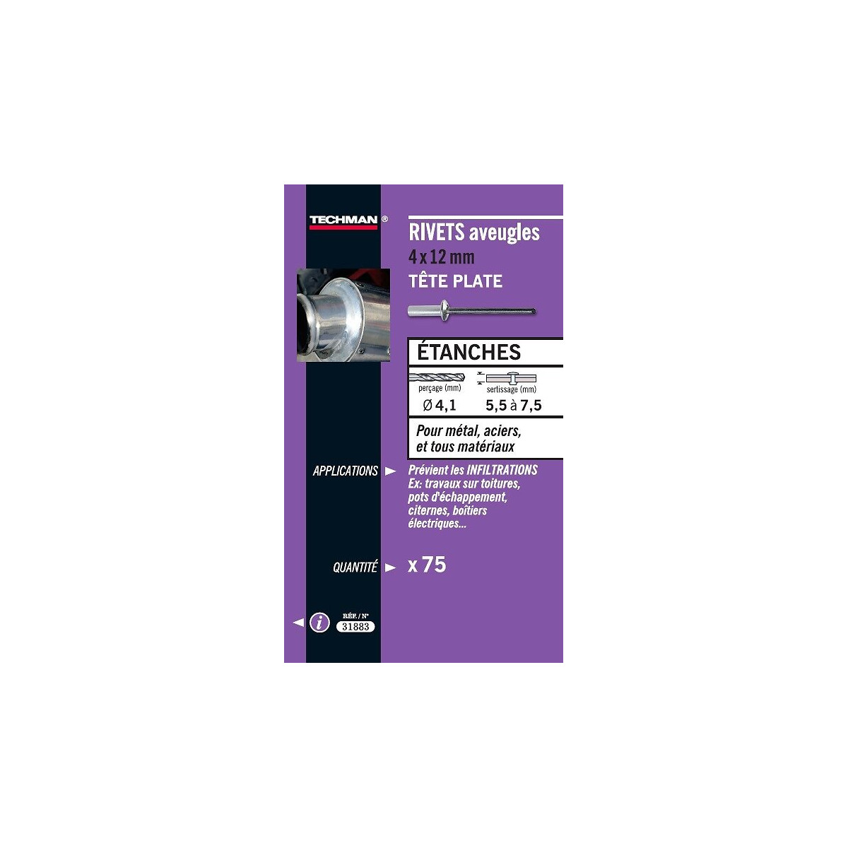 75 rivets étanches alu / acier à tête plate. Diamètre x longueur : 4 x 12 mm, diamètre perçage : 4,1 mm, épaisseur à sertir : 6 à 8 mm. Matériaux : métal, acier, … Applications : préviennent des infiltrations. Par exemple : travaux sur toitures et chêneaux, pots d’échappement, citernes, boîtiers électriques, …