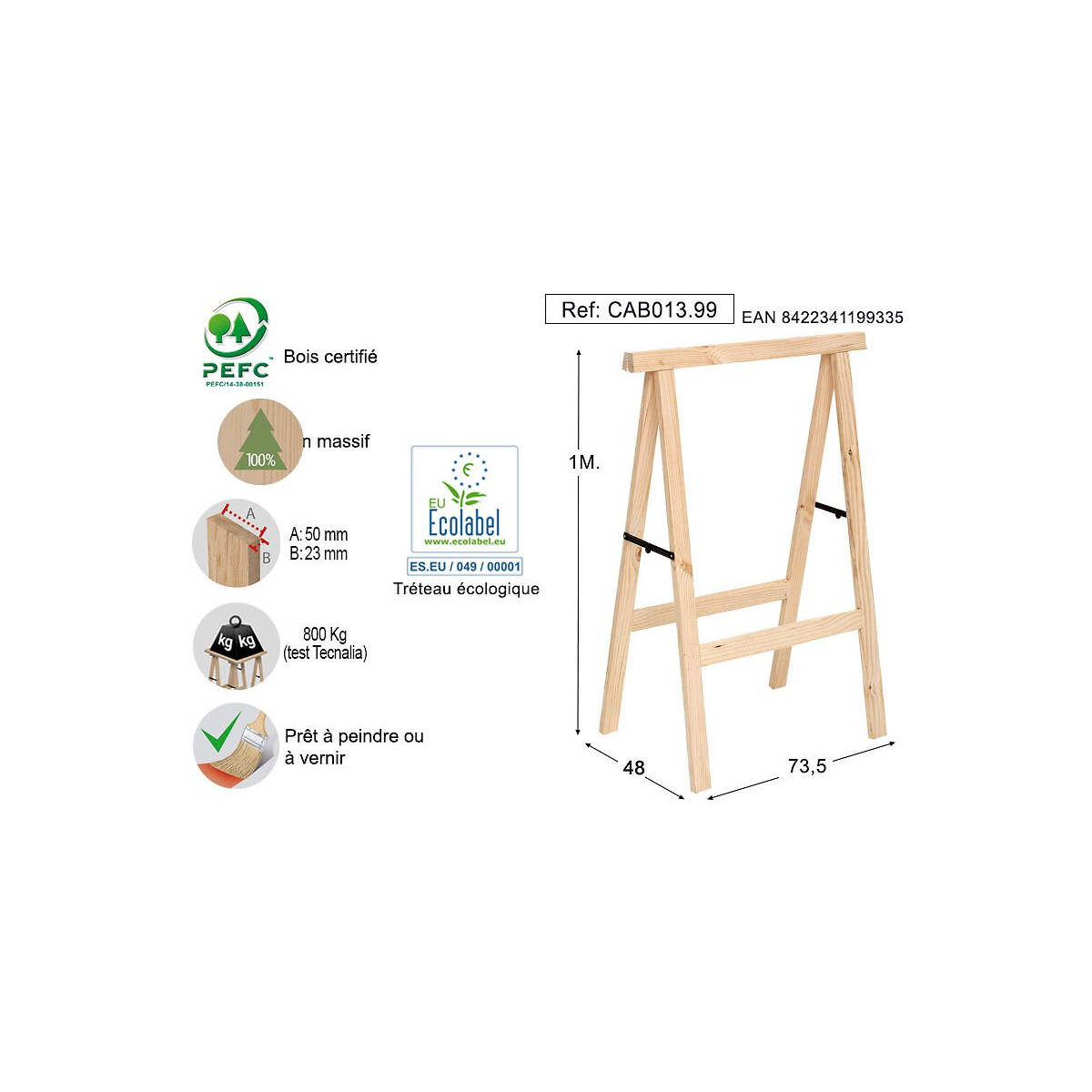 Ce tréteau se démarque par sa hauteur d'un mètre. Il est conçu pour travailler debout de façon saine, car il permet d'adopter une bonne ergonomie et d'avoir une posture qui évite les tensions lombaires et dorsales. Avec deux tréteaux et un plateau, vous pouvez créer une table ou un établi stable et résistant. Grande capacité de charge. Deux unités supportent jusqu'à 800kg. L'épaisseur des pieds est de 50x23mm, ce qui accroît la résistance du tréteau. Vous avez la possibilité d'y ajouter un plateau supplémentaire dans la partie inférieure, ce qui permet d'accroître l'espace de rangement. Mais vous pouvez aussi en faire autre chose. Avez-vous déjà pensé à installer un candy bar ou une table de bonbons pour les fêtes avec ces tréteaux d'un mètre ? Assemblez-en deux, posez-y un plateau, décorez-le à l'aide d'une nappe et créez une table pour sucreries originale, parfaite et délicieuse. Le bois de ce tréteau est doublement certifié : l'écolabel de l'Union européenne et le PEFC. Le bois d'Astigarraga Kit Line provient d'une gestion responsable des forêts locales et durables.